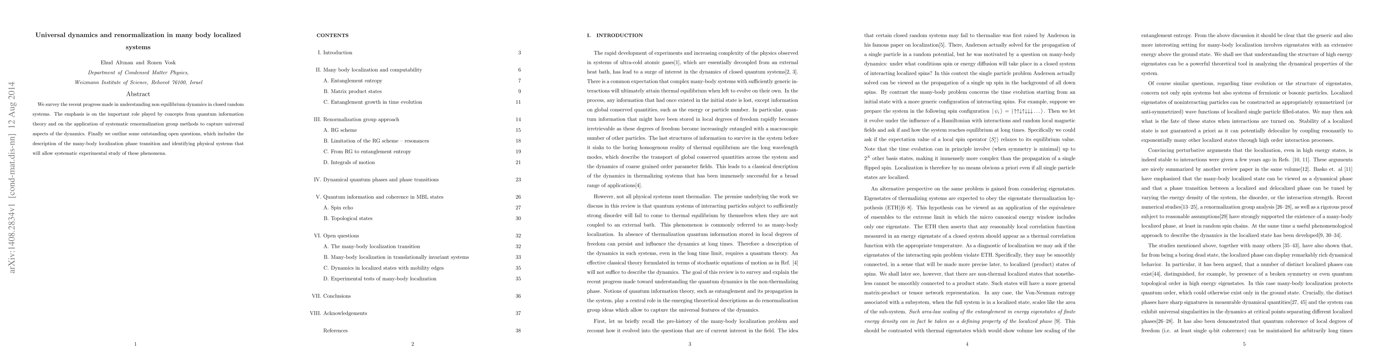 We survey the recent progress made in understanding non equilibrium dynamics in closed random systems. The emphasis is on the important role played by concepts from quantum information theory and on the application of systematic renormalization group methods to capture universal aspects of the dynamics. Finally we outline some outstanding open questions, which includee the description of the many-body localization phase transition and identifying physical systems that will allow systematic experimental study of these phenomena.