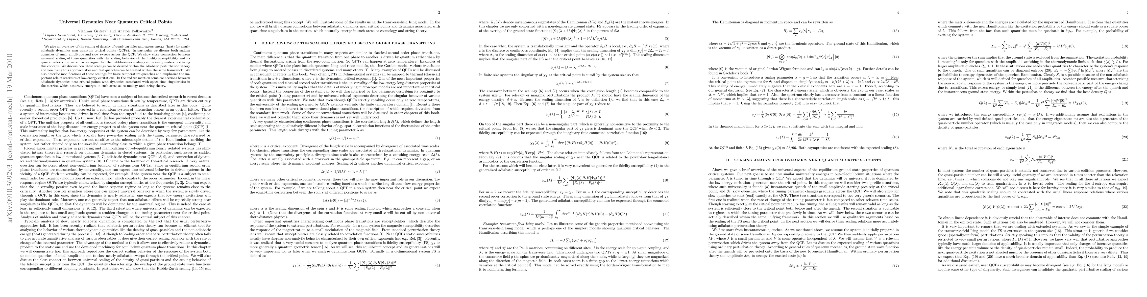 We give an overview of the scaling of density of quasi-particles and excess energy (heat) for nearly adiabatic dynamics near quantum critical points (QCPs). In particular we discuss both sudden quenches of small amplitude and slow sweeps across the QCP. We show close connection between universal scaling of these quantities with the scaling behavior of the fidelity susceptibility and its generalizations. In particular we argue that the Kibble-Zurek scaling can be easily understood using this concept. We discuss how these scalings can be derived within the adiabatic perturbation theory and how using this approach slow and fast quenches can be treated within the same framework. We also describe modifications of these scalings for finite temperature quenches and emphasize the important role of statistics of low-energy excitations. In the end we mention some connections between adiabatic dynamics near critical points with dynamics associated with space-time singularities in the metrics, which naturally emerges in such areas as cosmology and string theory.