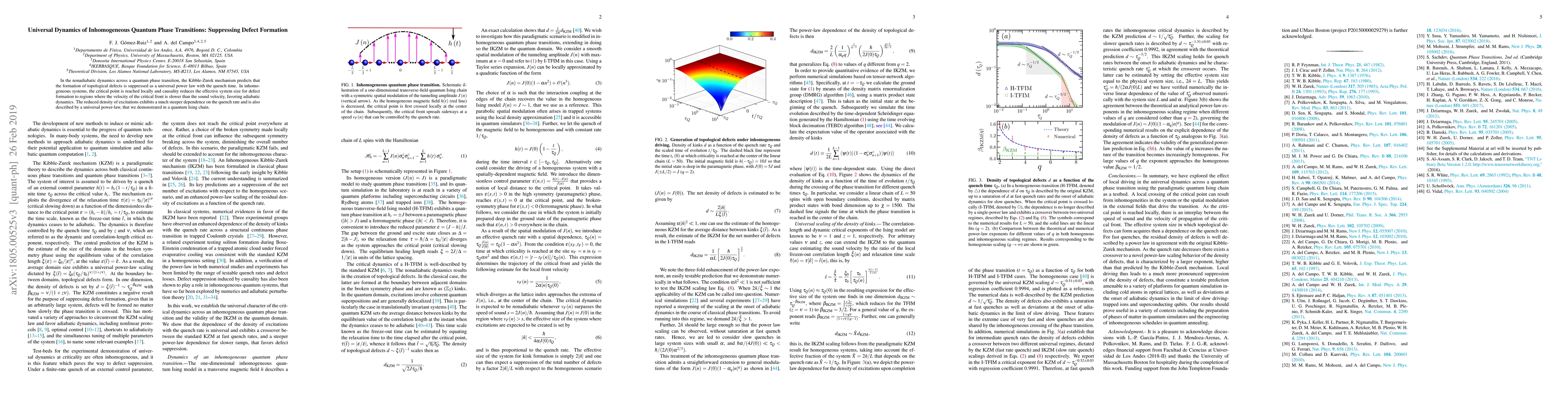 This paper investigates the dynamics of inhomogeneous quantum phase transitions and demonstrates that defect formation is suppressed by a universal power law with quench time. It shows that in such systems, adiabatic dynamics prevail in regions where the critical front's velocity is slower than the sound velocity, leading to a steeper dependence on the quench rate, as observed in a quantum Ising chain.
