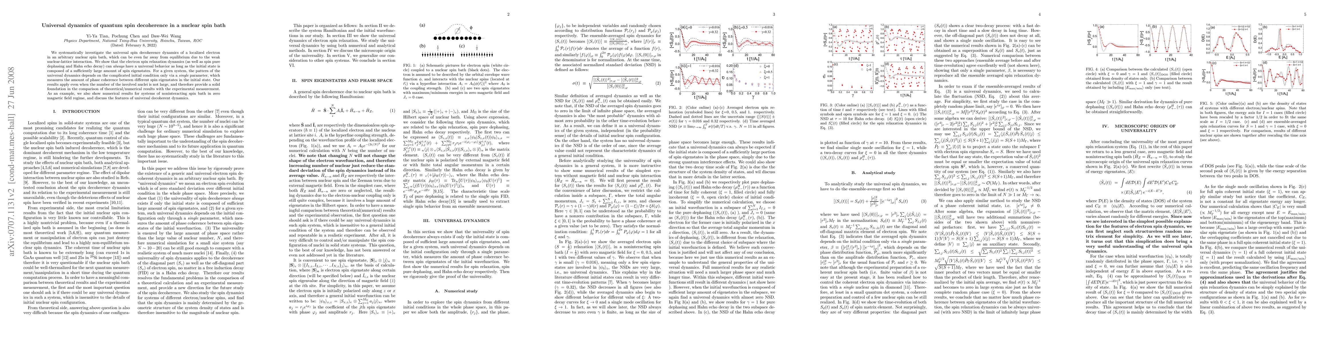 This paper explores the universal dynamics of quantum spin decoherence in a nuclear spin bath, demonstrating that electron spin relaxation and related processes exhibit consistent behavior governed by a single parameter measuring initial phase coherence. The findings provide a robust framework for comparing theoretical models with experimental data, even for small nuclear spin systems.