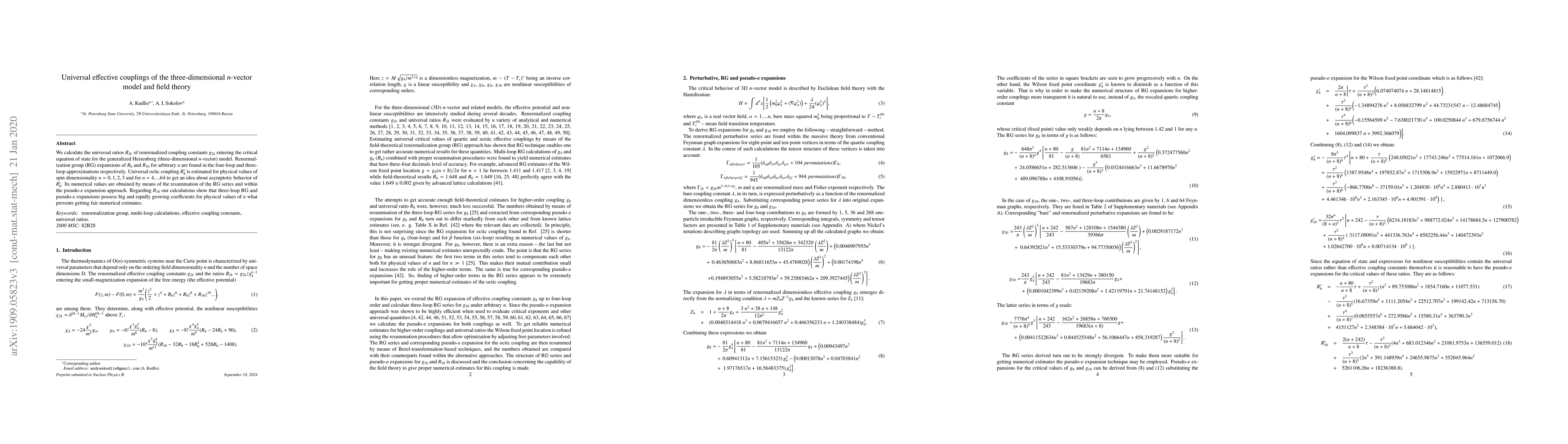 This paper calculates universal ratios of renormalized coupling constants for the three-dimensional $n$-vector model, finding RG expansions for $R_8$ and $R_{10}$ at four-loop and three-loop approximations respectively. It estimates the universal octic coupling $R_8^*$ for various spin dimensionalities and discusses the challenges in obtaining numerical estimates for $R_{10}$.
