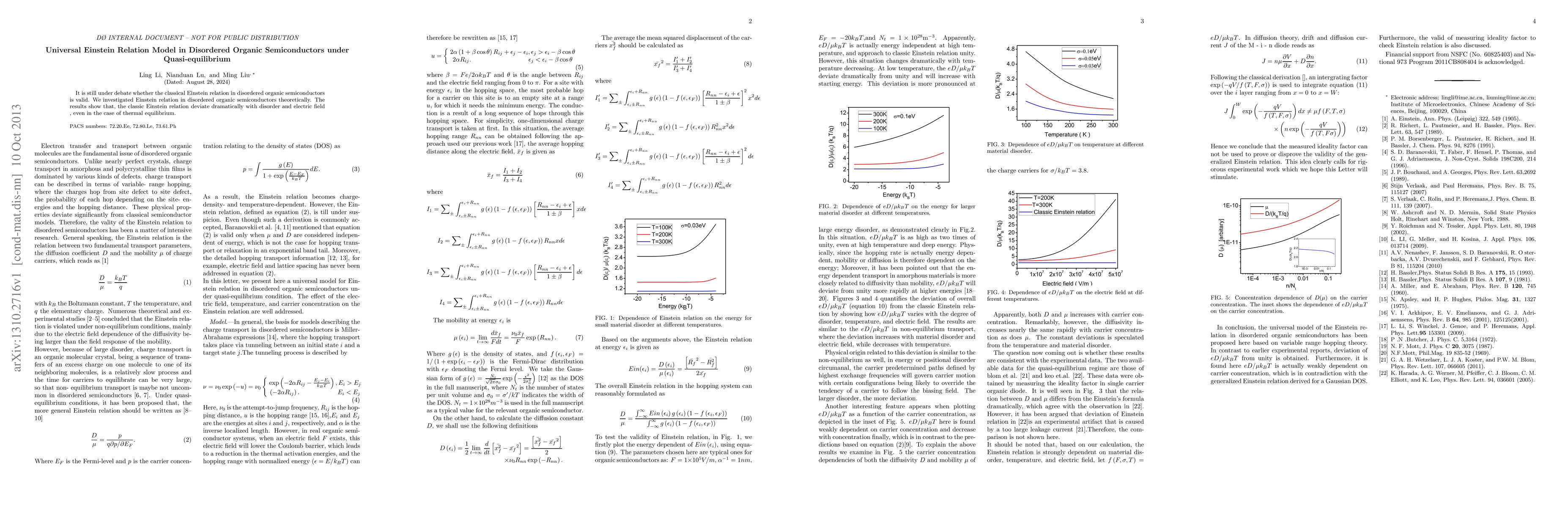 Summary: This study theoretically examines the validity of the classical Einstein relation in disordered organic semiconductors, finding significant deviations due to disorder and electric fields, even in thermal equilibrium conditions. The universal Einstein relation model is challenged in these materials.