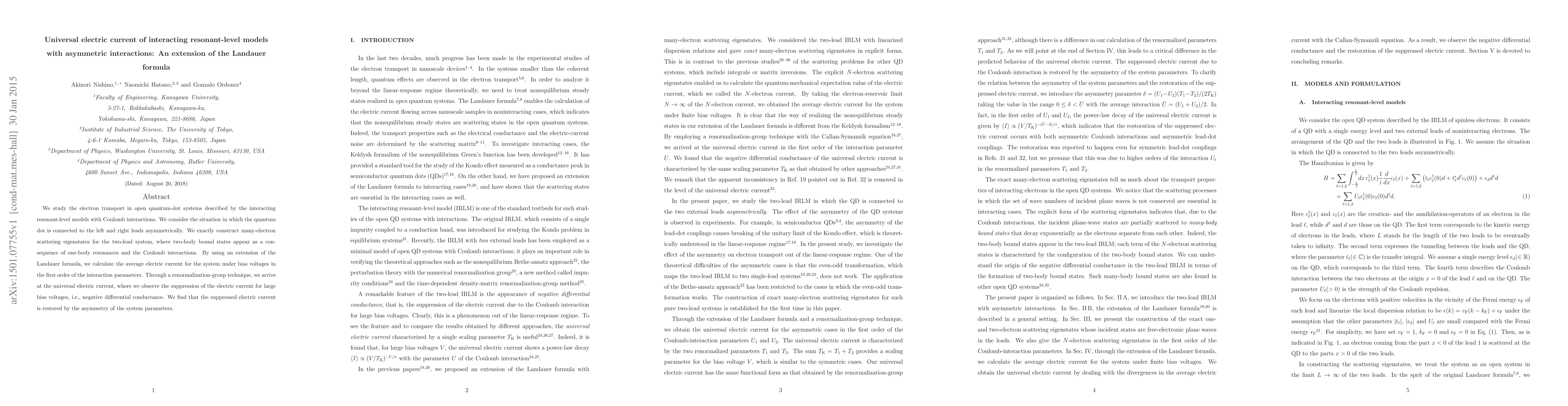 This paper investigates electron transport in asymmetric quantum-dot systems using an extended Landauer formula, revealing the suppression of electric current at high biases, known as negative differential conductance, which is restored by system asymmetry. The study employs renormalization-group techniques to derive the universal electric current behavior.