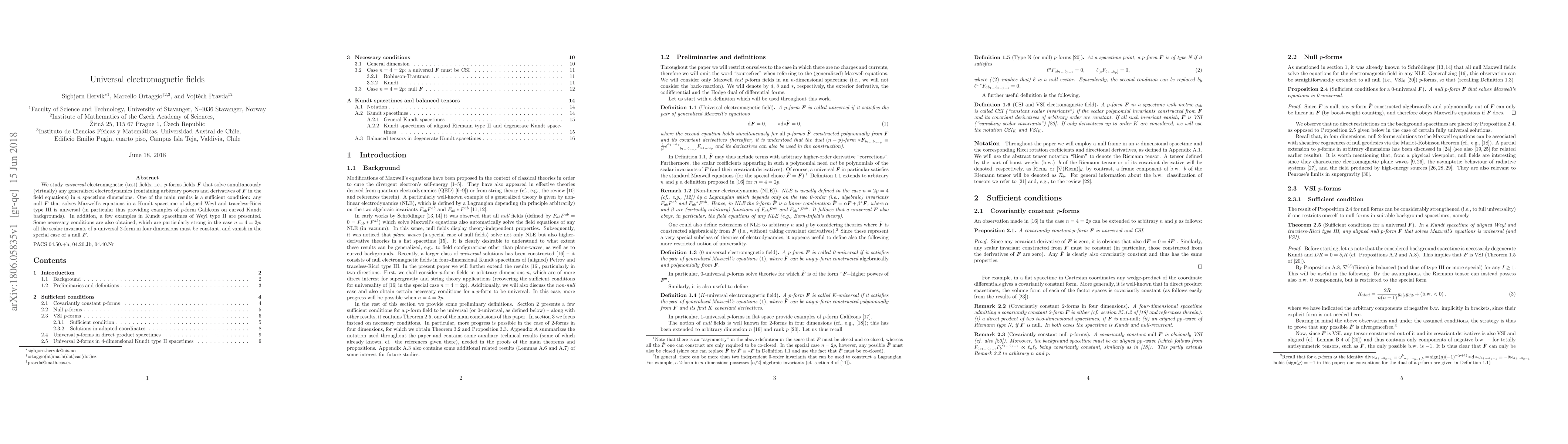 We study universal electromagnetic (test) fields, i.e., p-forms fields F that solve simultaneously (virtually) any generalized electrodynamics (containing arbitrary powers and derivatives of F in the field equations) in n spacetime dimensions. One of the main results is a sufficient condition: any null F that solves Maxwell's equations in a Kundt spacetime of aligned Weyl and traceless-Ricci type III is universal (in particular thus providing examples of p-form Galileons on curved Kundt backgrounds). In addition, a few examples in Kundt spacetimes of Weyl type II are presented. Some necessary conditions are also obtained, which are particularly strong in the case n=4=2p: all the scalar invariants of a universal 2-form in four dimensions must be constant, and vanish in the special case of a null F .