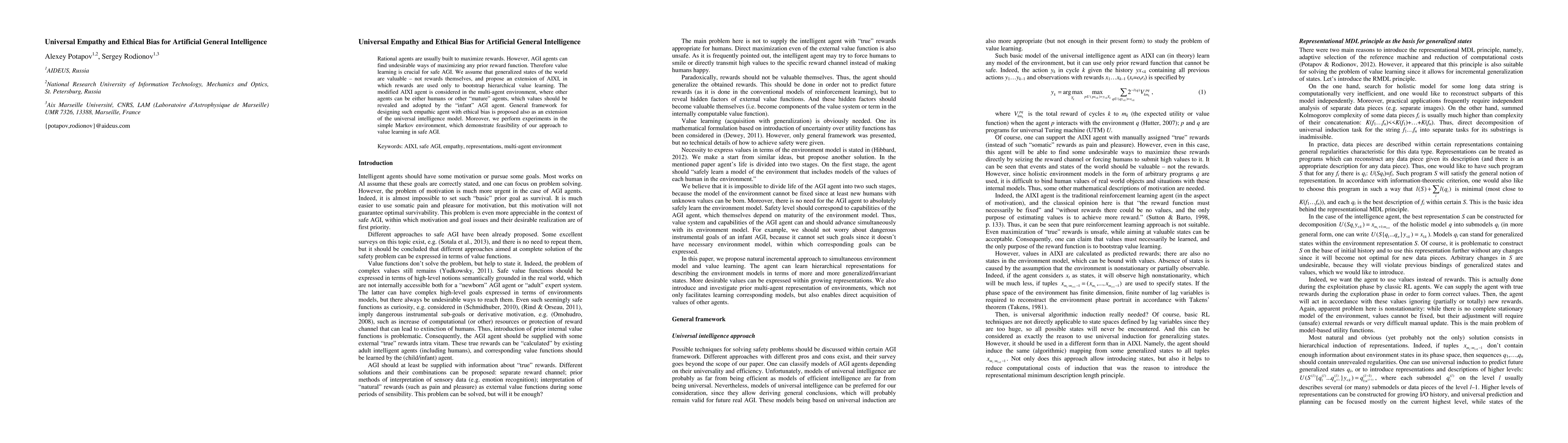 Rational agents are usually built to maximize rewards. However, AGI agents can find undesirable ways of maximizing any prior reward function. Therefore value learning is crucial for safe AGI. We assume that generalized states of the world are valuable - not rewards themselves, and propose an extension of AIXI, in which rewards are used only to bootstrap hierarchical value learning. The modified AIXI agent is considered in the multi-agent environment, where other agents can be either humans or other "mature" agents, which values should be revealed and adopted by the "infant" AGI agent. General framework for designing such empathic agent with ethical bias is proposed also as an extension of the universal intelligence model. Moreover, we perform experiments in the simple Markov environment, which demonstrate feasibility of our approach to value learning in safe AGI.