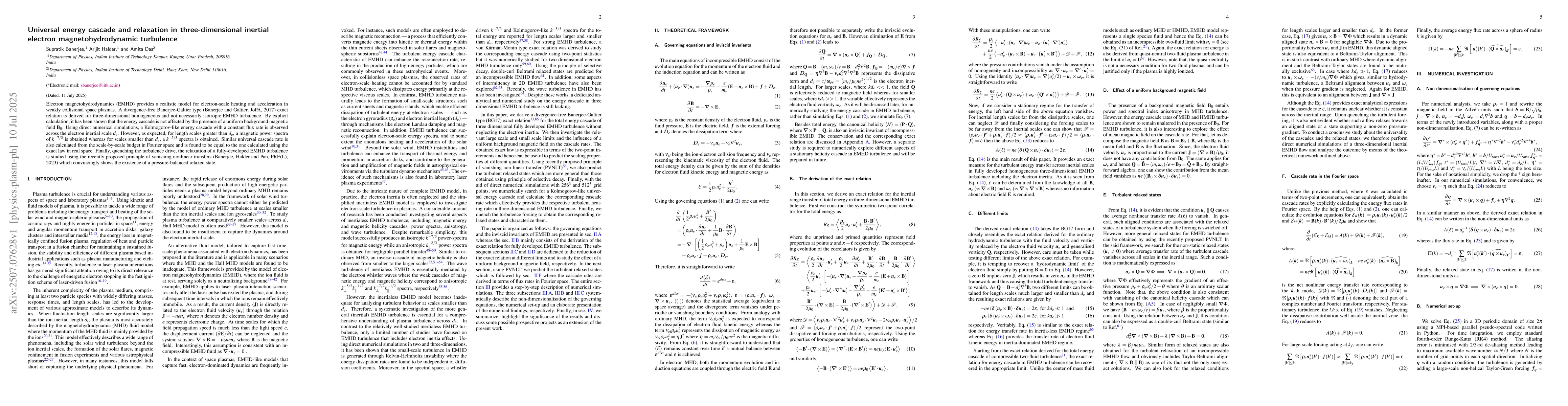 Electron magnetohydrodynamics (EMHD) provides a realistic model for electron-scale heating and acceleration in weakly collisional space plasmas. A divergence-free Banerjee-Galtier type (Banerjee and Galtier, JoPA, 2017) exact relation is derived for three-dimensional homogeneous and not necessarily isotropic EMHD turbulence. By explicit calculation, it has been shown that the energy cascade is not affected by the presence of a uniform background magnetic field Bo. Using direct numerical simulations, a Kolmogorov-like energy cascade with a constant flux rate is observed across the electron inertial scale $d_e$. However, as expected, for length scales greater than $d_e$, a magnetic power spectra of $k^{-7/3}$ is obtained whereas for scales smaller than $d_e$, a $k^{-5/3}$ spectra is obtained. Similar universal cascade rate is also calculated from the scale-by-scale budget in Fourier space and is found to be equal to the one calculated using the exact law in real space. Finally, quenching the turbulence drive, the relaxation of a fully-developed EMHD turbulence is studied using the recently proposed principle of vanishing nonlinear transfers (Banerjee, Halder and Pan, PRE(L), 2023) which convincingly shows the existence of a pressure-balanced relaxed state.