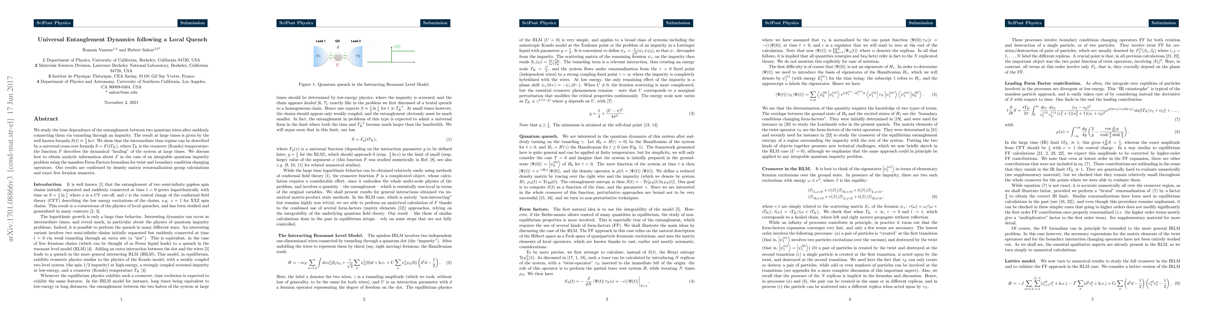 We study the time dependence of the entanglement between two quantum wires after suddenly connecting them via tunneling through an impurity. The result at large times is given by the well known formula $S(t) \approx {1\over 3}\ln {t}$. We show that the intermediate time regime can be described by a universal cross-over formula $S=F(tT_K)$, where $T_K$ is the crossover (Kondo) temperature: the function $F$ describes the dynamical "healing" of the system at large times. We discuss how to obtain analytic information about $F$ in the case of an integrable quantum impurity problem using the massless Form-Factors formalism for twist and boundary condition changing operators. Our results are confirmed by density matrix renormalization group calculations and exact free fermion numerics.