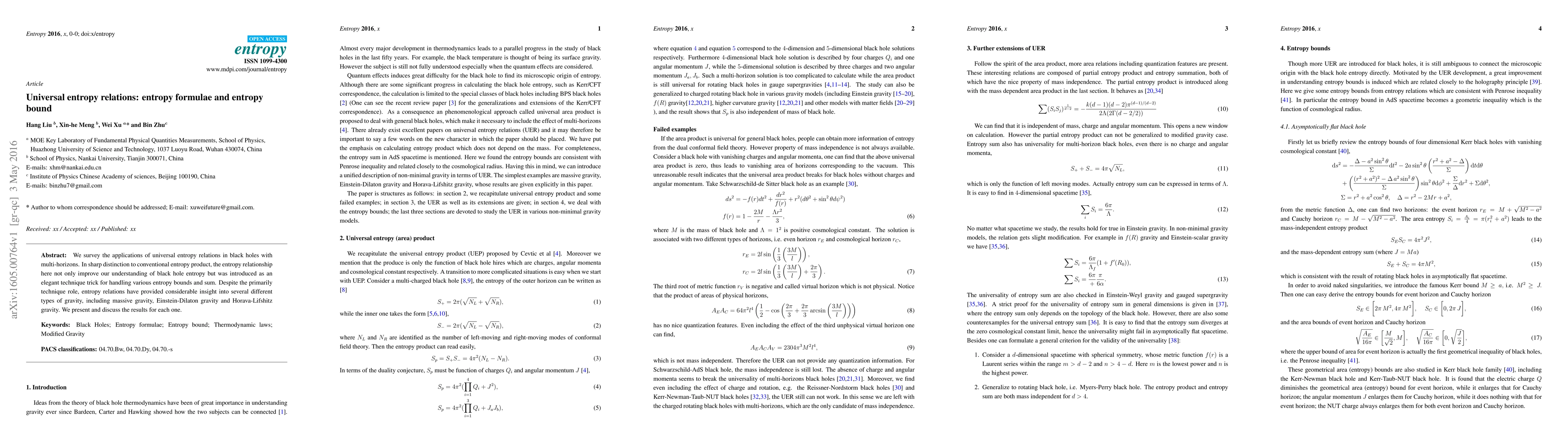 This paper surveys the applications of universal entropy relations in multi-horizon black holes, highlighting their role in improving black hole entropy understanding and handling entropy bounds. It provides insights into various gravity theories, including massive gravity, Einstein-Dilaton gravity, and Horava-Lifshitz gravity.