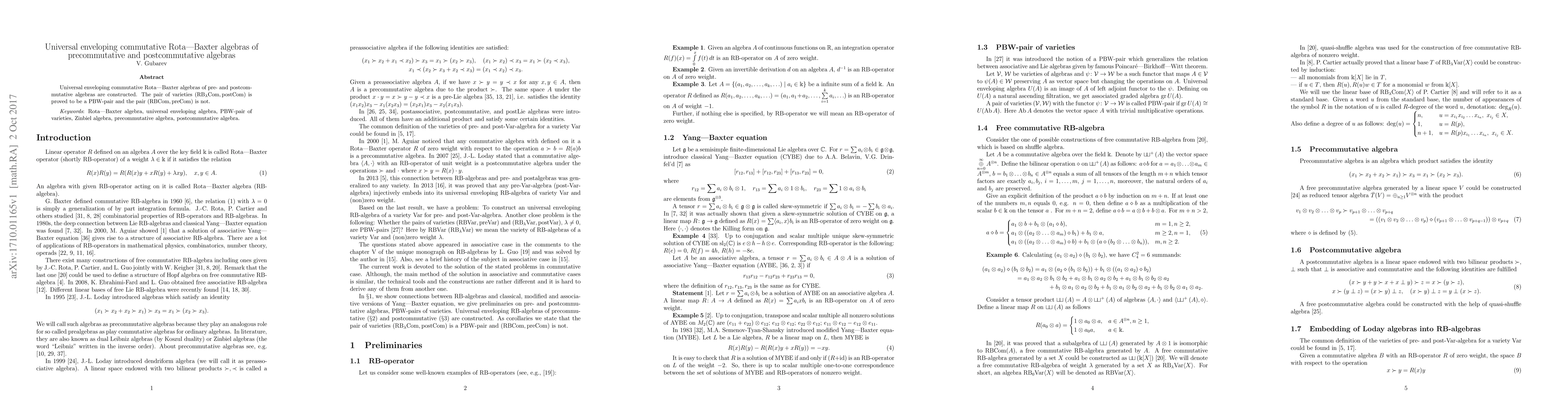 Universal enveloping commutative Rota-Baxter algebras of pre- and postcommutative algebras are constructed. We prove that the pair of varieties (commutative Rota-Baxter algebras of nonzero weight,postcommutative algebras) is a PBW-pair and the pair (commutative Rota-Baxter algebras of zero weight,precommutative algebras) is not.