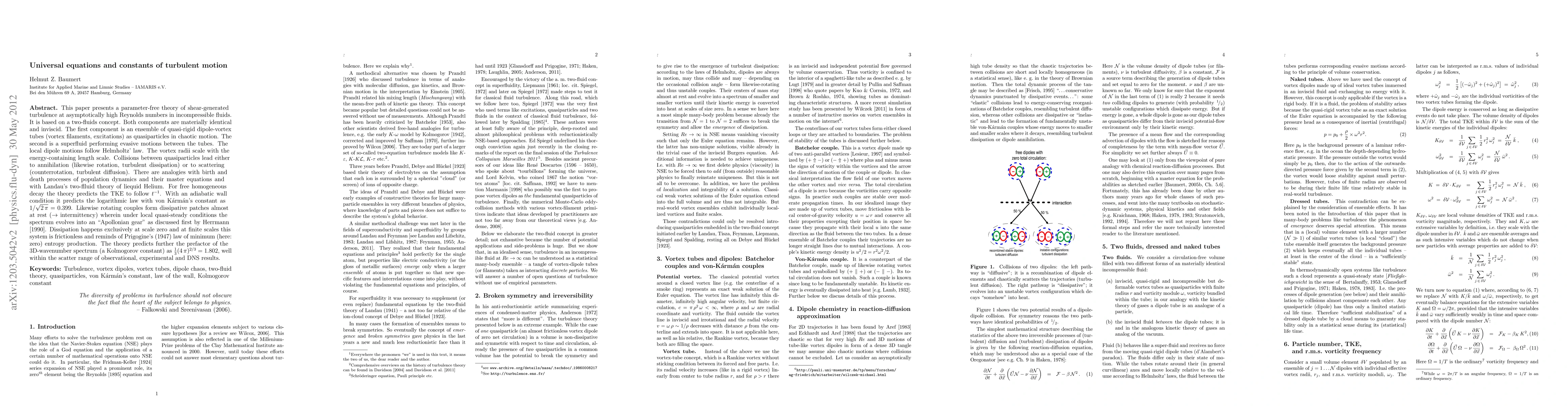 This paper presents a parameter-free theory of shear-generated turbulence at asymptotically high Reynolds numbers in incompressible fluids. It is based on a two-fluids concept. Both components are materially identical and inviscid. The first component is an ensemble of quasi-rigid dipole-vortex tubes as quasi-particles in chaotic motion. The second is a superfluid performing evasive motions between the tubes. The local dipole motions follow Helmholtz' law. The vortex radii scale with the energy-containing length scale. Collisions between quasi-particles lead either to annihilation (likewise rotation, turbulent dissipation) or to scattering (counterrotation, turbulent diffusion). There are analogies with birth and death processes of population dynamics and their master equations. For free homogeneous decay the theory predicts the TKE to follow 1/t. With an adiabatic condition at the wall it predicts the logarithmic law with von Karman's constant as 1/\sqrt{2 pi} = 0.399. Likewise rotating couples form dissipative patches almost at rest ($\rightarrow$ intermittency) wherein the spectrum evolves like an "Apollonian gear" as discussed first by Herrmann, 1990. On this basis the prefactor of the 3D-wavenumber spectrum is predicted as (1/3)(4 pi)^{2/3}=1.8; in the Lagrangian frequency spectrum it is simply 2. The results are situated well within the scatter range of observational, experimental and DNS results.