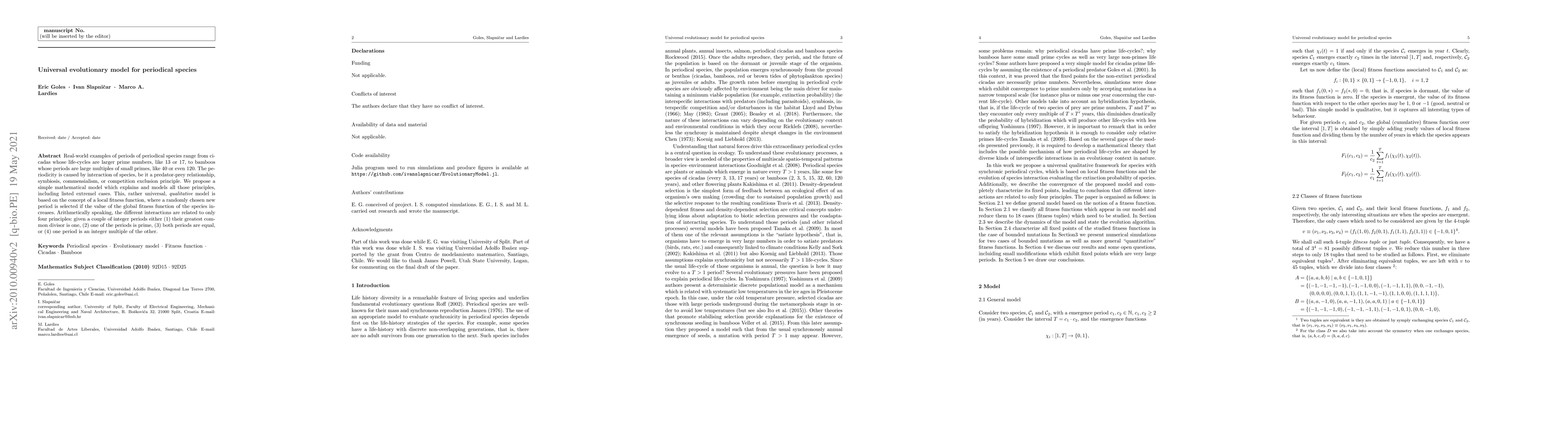 This paper proposes a universal evolutionary model explaining periodicity in species through interactions like predator-prey dynamics and symbiosis, using a mathematical framework based on local and global fitness functions. The model identifies four arithmetic principles governing periodicity, including cases where periods are prime numbers or multiples.