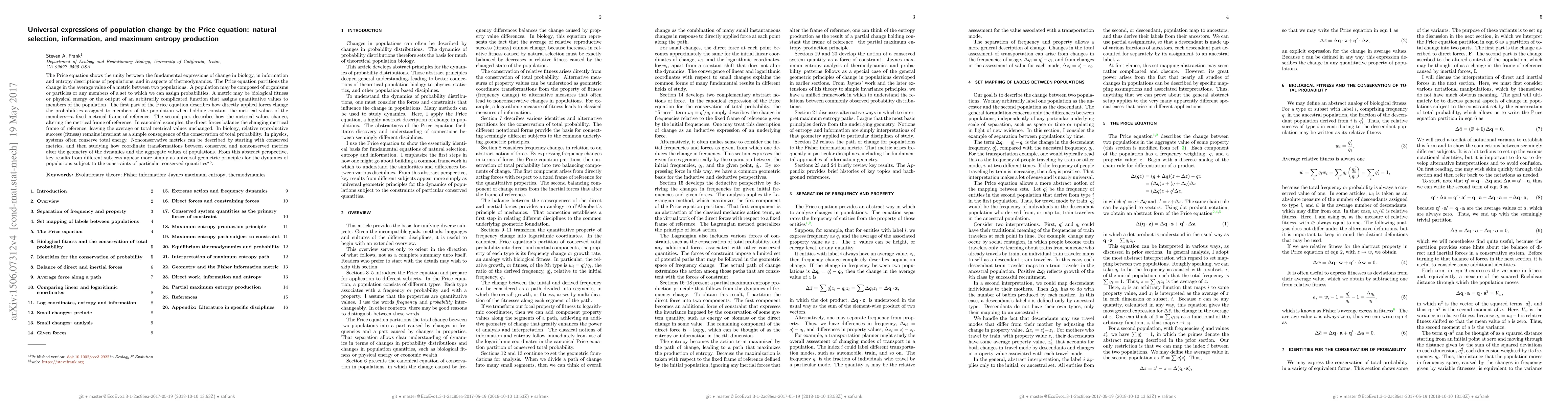 The Price equation unifies biological, informational, and thermodynamic descriptions of population change by partitioning the change in average metric values. It reveals universal geometric principles governing the dynamics of populations under conserved quantity constraints, such as fitness in biology and energy in physics.