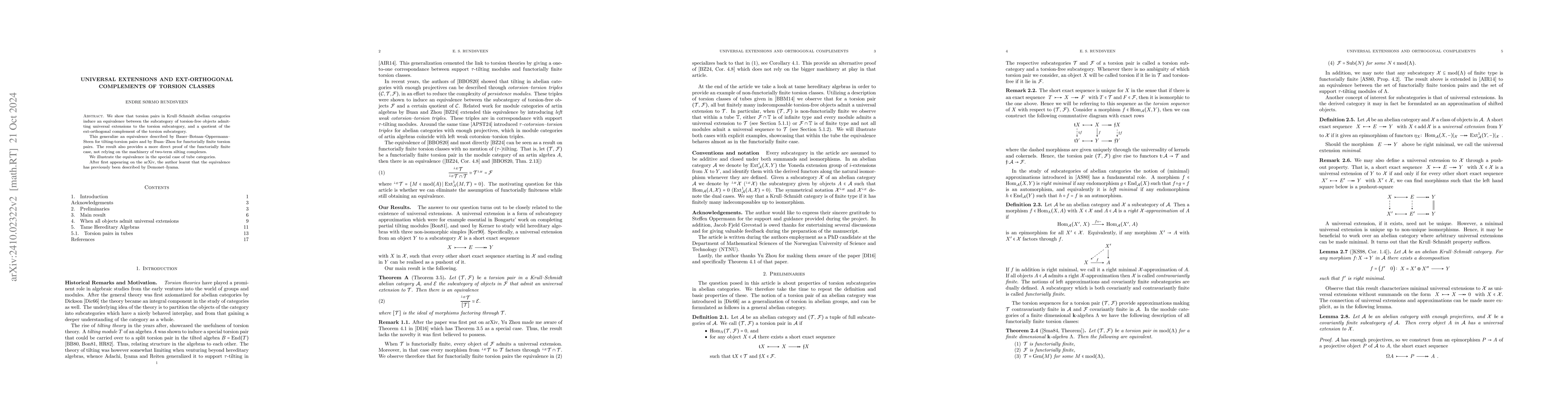 We show that torsion pairs in Krull--Schmidt abelian categories induce an equivalence between the subcategory of torsion-free objects admitting universal extensions to the torsion subcategory, and a quotient of the ext-orthogonal complement of the torsion subcategory. This generalize an equivalence described by Bauer--Botnan--Oppermann--Steen for tilting-torsion pairs and by Buan--Zhou for functorially finite torsion pairs. The result also provides a more direct proof of the functorially finite case, not relying on the machinery of two-term silting complexes. We illustrate the equivalence in the special case of tube categories. After first appearing on the arXiv, the author learnt that the equivalence has previously been described by Demonet--Iyama.