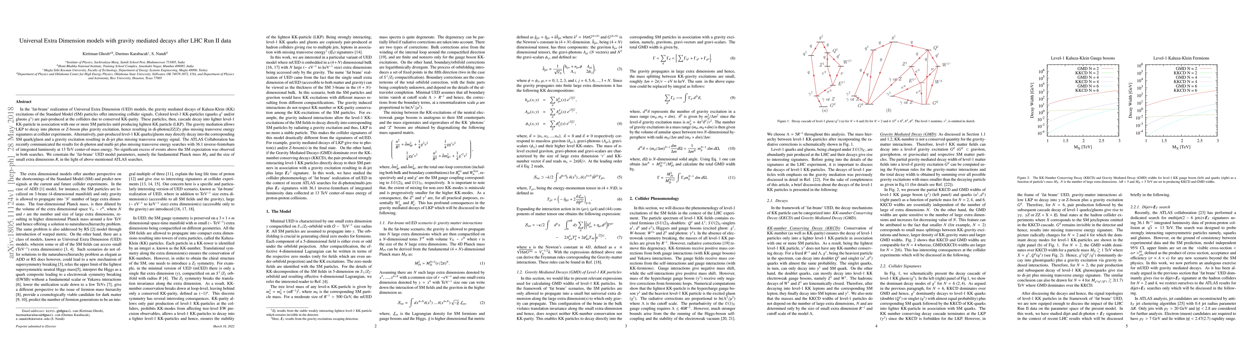 In the 'fat-brane' realization of Universal Extra Dimension (UED) models, the gravity mediated decays of Kaluza-Klein (KK) excitations of the Standard Model (SM) particles offer interesting collider signals. Colored level-1 KK-particles (quarks $q^1$ and/or gluons $g^{1}$) are pair-produced at the colliders due to conserved KK-parity. These particles, then, cascade decay into lighter level-1 KK-particle in association with one or more SM particles until producing lightest KK particle (LKP). The gravity mediation allows LKP to decay into photon or $Z$-boson plus gravity excitation, hence resulting in di-photon/$ZZ$/$Z\gamma$ plus missing transverse energy signatures at collider experiments. Alternatively, pair-produced level-1 KK quarks/gluons may directly decay into the corresponding SM quark/gluon and a gravity excitation resulting in di-jet plus missing transverse energy signal. The ATLAS Collaboration has recently communicated the results for di-photon and multi-jet plus missing transverse energy searches with $36.1$ inverse-femtobarn of integrated luminosity at $13$ TeV center-of-mass energy. No significant excess of events above the SM expectation was observed in both searches. We constrain the 'fat-brane' UED model parameters, namely the fundamental Planck mass $M_{D}$ and the size of small extra dimensions $R$, in the light of above-mentioned ATLAS searches.