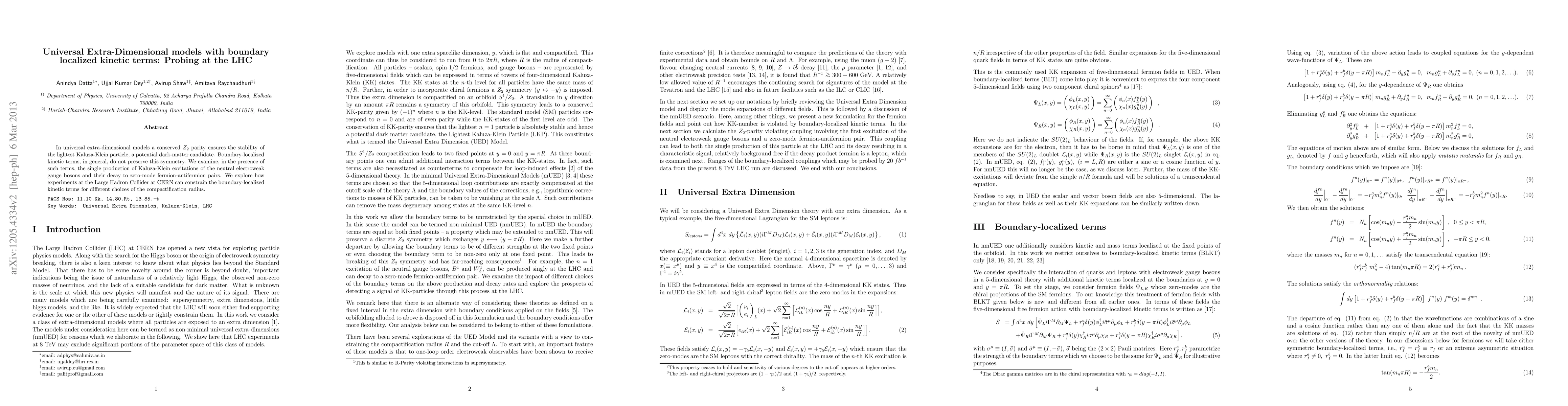 In universal extra-dimensional models a conserved $Z_2$ parity ensures the stability of the lightest Kaluza-Klein particle, a potential dark-matter candidate. We show here that boundary-localized kinetic terms, in general, do not preserve this symmetry. We examine the single production of a Kaluza-Klein excitation of the photon and its decay to zero-mode fermion-antifermion pairs in the presence of such terms. We explore how experiments at the Large Hadron Collider at CERN can help constrain the boundary-localized kinetic terms for different choices of the compactification radius.