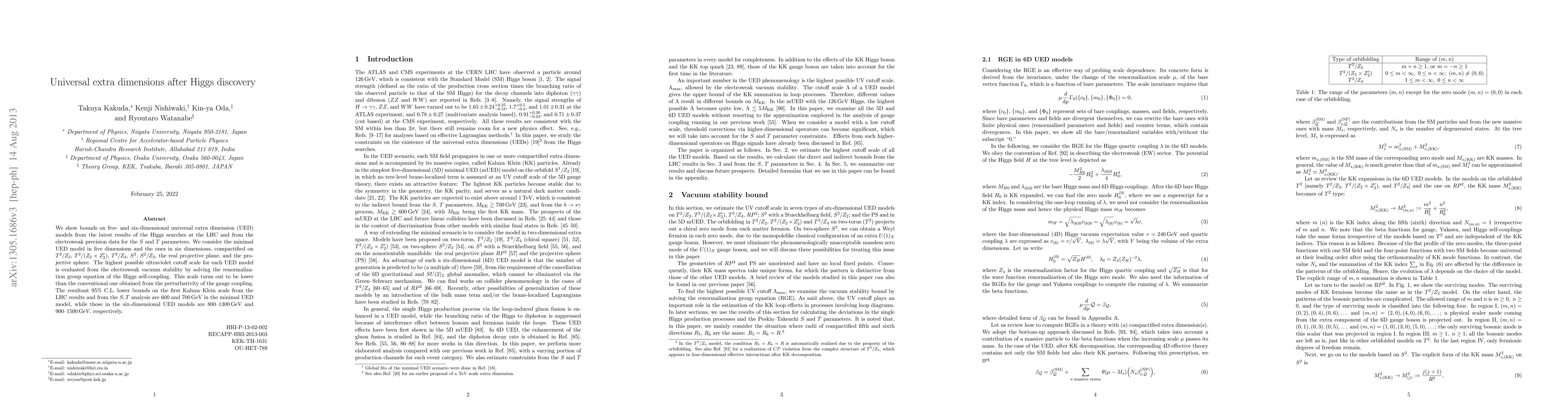 We show bounds on five- and six-dimensional universal extra dimension (UED) models from the latest results of the Higgs searches at the LHC and from the electroweak precision data for the S and T parameters. We consider the minimal UED model in five dimensions and the ones in six dimensions. The highest possible ultraviolet cutoff scale for each UED model is evaluated from the electroweak vacuum stability by solving the renormalization group equation of the Higgs self-coupling. This scale turns out to be lower than the conventional one obtained from the perturbativity of the gauge coupling. The resultant 95% C.L. lower bounds on the first Kaluza-Klein scale from the LHC results and from the S, T analysis are 600 and 700 GeV in the minimal UED model, while those in the six-dimensional UED models are 800-1300 GeV and 900-1500 GeV, respectively.