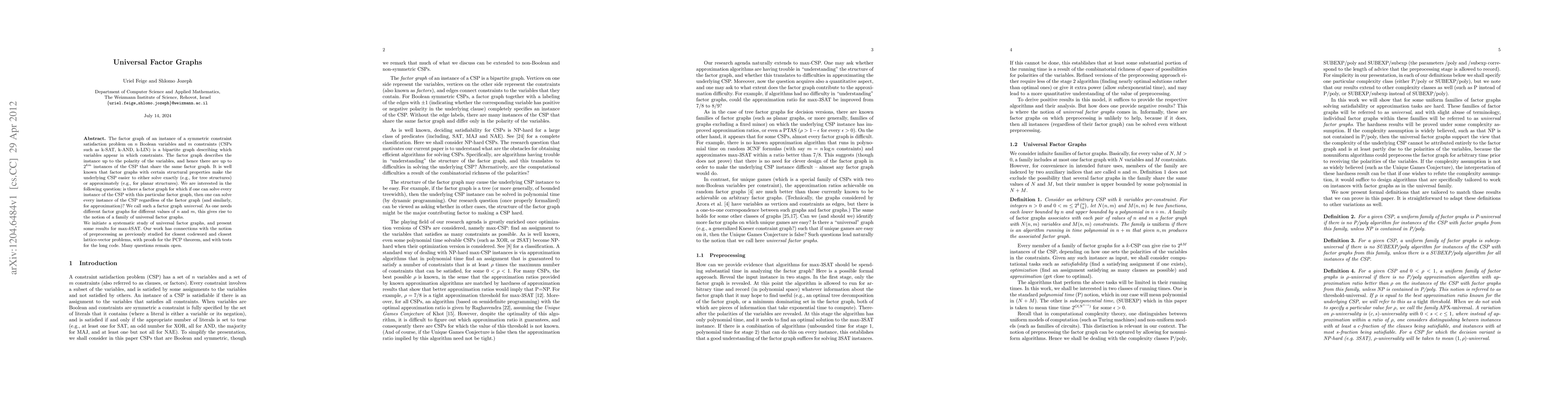 The factor graph of an instance of a symmetric constraint satisfaction problem on n Boolean variables and m constraints (CSPs such as k-SAT, k-AND, k-LIN) is a bipartite graph describing which variables appear in which constraints. The factor graph describes the instance up to the polarity of the variables, and hence there are up to 2km instances of the CSP that share the same factor graph. It is well known that factor graphs with certain structural properties make the underlying CSP easier to either solve exactly (e.g., for tree structures) or approximately (e.g., for planar structures). We are interested in the following question: is there a factor graph for which if one can solve every instance of the CSP with this particular factor graph, then one can solve every instance of the CSP regardless of the factor graph (and similarly, for approximation)? We call such a factor graph universal. As one needs different factor graphs for different values of n and m, this gives rise to the notion of a family of universal factor graphs. We initiate a systematic study of universal factor graphs, and present some results for max-kSAT. Our work has connections with the notion of preprocessing as previously studied for closest codeword and closest lattice-vector problems, with proofs for the PCP theorem, and with tests for the long code. Many questions remain open.