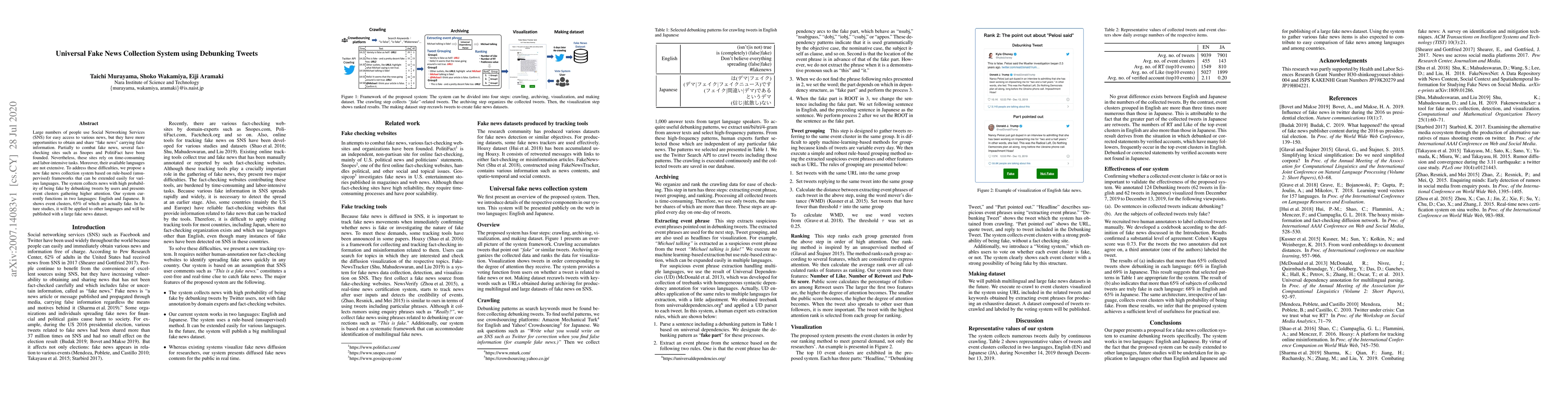 This paper proposes a universal fake news collection system leveraging debunking tweets to identify potentially false news stories. The system, currently operational in English and Japanese, clusters news events with high attention, showing 65% of these clusters contain fake news, and aims to expand to more languages with future updates.