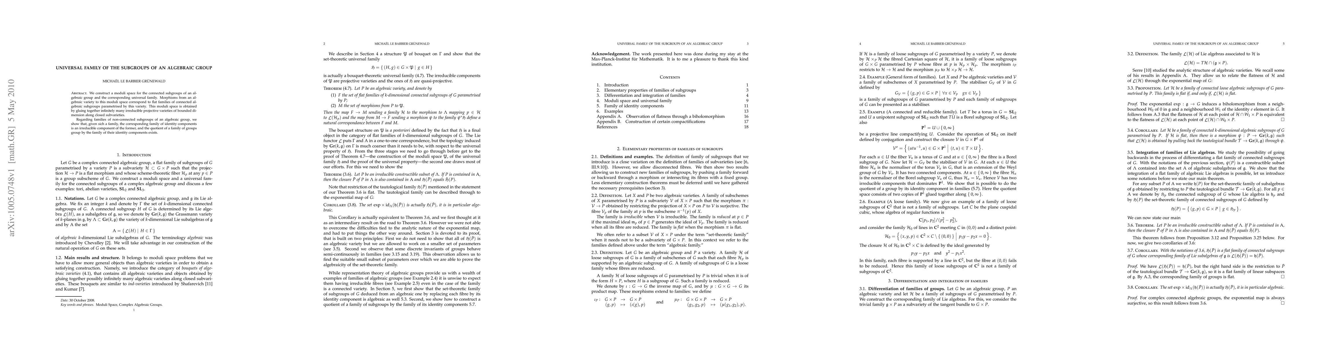This paper constructs a moduli space for connected subgroups of an algebraic group and a corresponding universal family, showing that morphisms to this space correspond to flat families of such subgroups. It also addresses families of non-connected subgroups, proving that their identity components form an irreducible component and that quotients by these components exist.