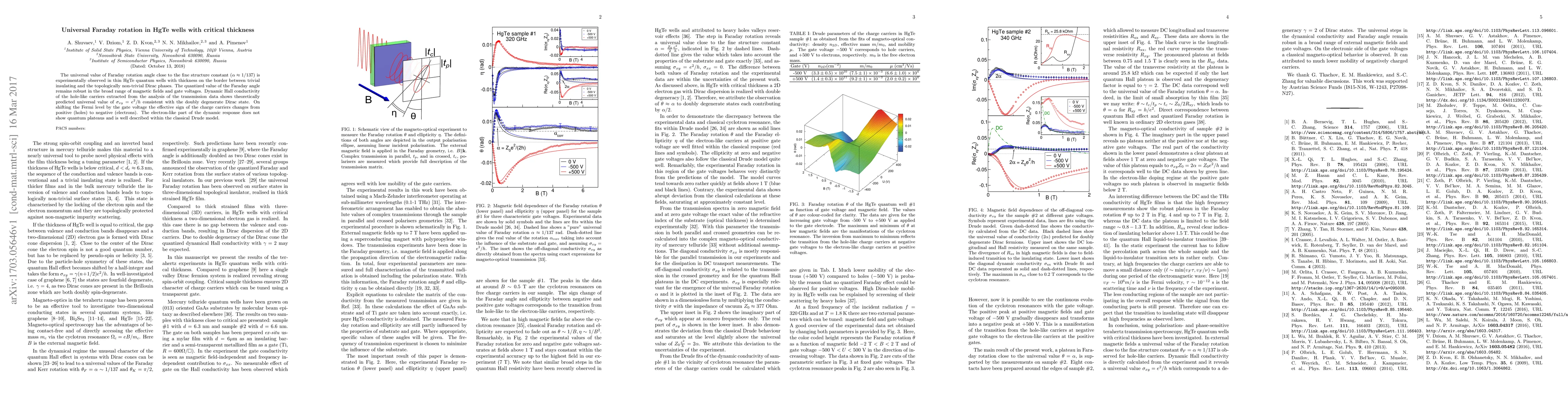 The universal value of Faraday rotation angle close to the fine structure constant is experimentally observed in thin HgTe quantum wells with thickness on the border between trivial insulating and the topologically non-trivial Dirac phases. The quantized value of the Faraday angle remains robust in the broad range of magnetic fields and gate voltages. Dynamic Hall conductivity of the hole-like carriers extracted from the analysis of the transmission data shows theoretically predicted universal value of consistent with the doubly degenerate Dirac state. On shifting the Fermi level by the gate voltage the effective sign of the charge carriers changes from positive (holes) to negative (electrons). The electron-like part of the dynamic response does not show quantum plateaus and is well described within the classical Drude model.