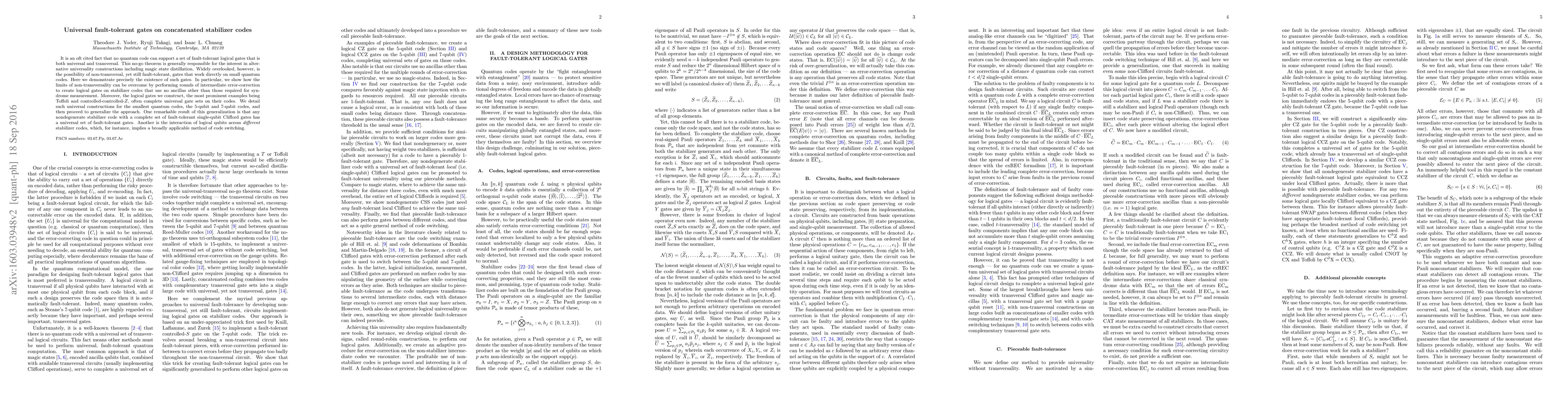 This paper demonstrates the existence of fault-tolerant, non-transversal universal logical gates on concatenated stabilizer codes, achieved through intermediate error-correction. It provides a universal gate set for small quantum codes like the 5-qubit and 7-qubit codes, and generalizes this approach to any nondegenerate stabilizer code with complete single-qubit Clifford gates.
