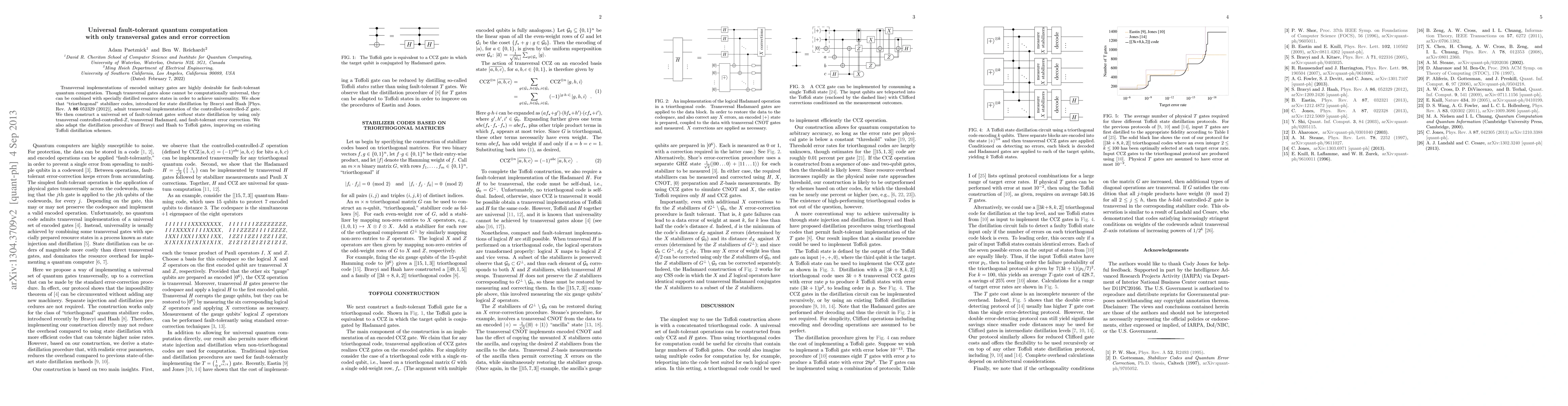 This paper demonstrates a method for achieving universal fault-tolerant quantum computation using only transversal gates and error correction. It utilizes "triorthogonal" stabilizer codes to implement the controlled-controlled-Z gate transversally, constructing a universal gate set with transversal controlled-controlled-Z, Hadamard, and error correction, while improving Toffoli gate distillation.