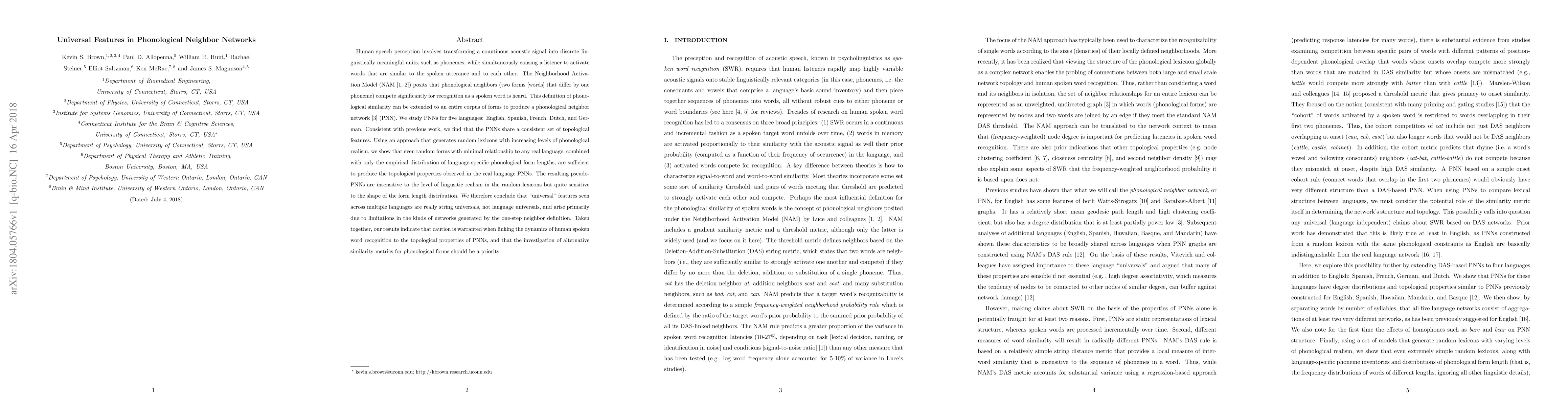 Human speech perception involves transforming a countinous acoustic signal into discrete linguistically meaningful units, such as phonemes, while simultaneously causing a listener to activate words that are similar to the spoken utterance and to each other. The Neighborhood Activation Model (NAM~\cite{Luce:1986,Luce:1998}) posits that phonological neighbors (two forms [words] that differ by one phoneme) compete significantly for recognition as a spoken word is heard. This definition of phonological similarity can be extended to an entire corpus of forms to produce a phonological neighbor network~\cite{Vitevitch:2008} (PNN). We study PNNs for five languages: English, Spanish, French, Dutch, and German. Consistent with previous work, we find that the PNNs share a consistent set of topological features. Using an approach that generates random lexicons with increasing levels of phonological realism, we show that even random forms with minimal relationship to any real language, combined with only the empirical distribution of language-specific phonological form lengths, are sufficient to produce the topological properties observed in the real language PNNs. The resulting pseudo-PNNs are insensitive to the level of lingusitic realism in the random lexicons but quite sensitive to the shape of the form length distribution. We therefore conclude that "universal" features seen across multiple languages are really string universals, not language universals, and arise primarily due to limitations in the kinds of networks generated by the one-step neighbor definition. Taken together, our results indicate that caution is warranted when linking the dynamics of human spoken word recognition to the topological properties of PNNs, and that the investigation of alternative similarity metrics for phonological forms should be a priority.
