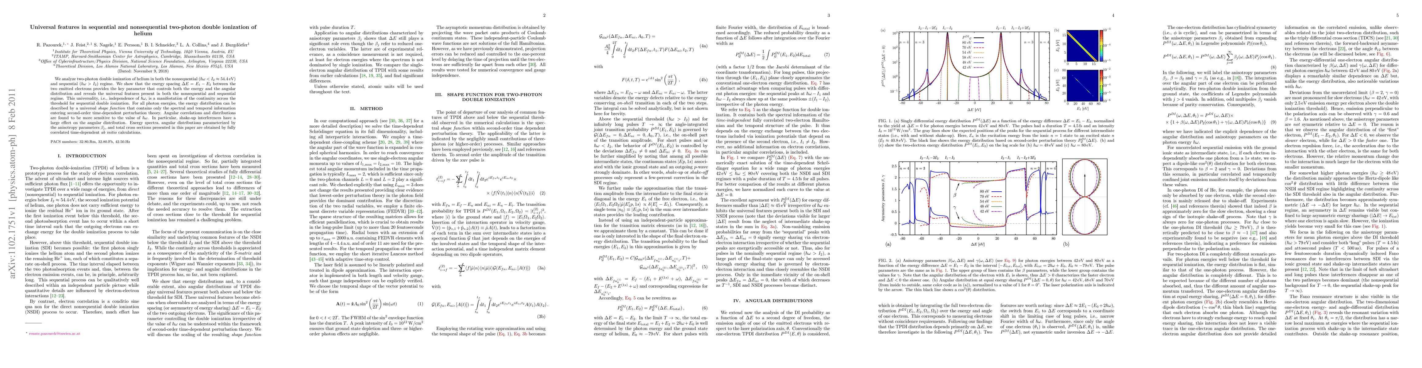 This paper investigates the universal features in both nonsequential and sequential two-photon double ionization of helium, demonstrating that the energy spacing between emitted electrons governs the energy and angular distributions. The study reveals a universal shape function for energy distribution independent of photon energy, highlighting the continuity across the ionization threshold.
