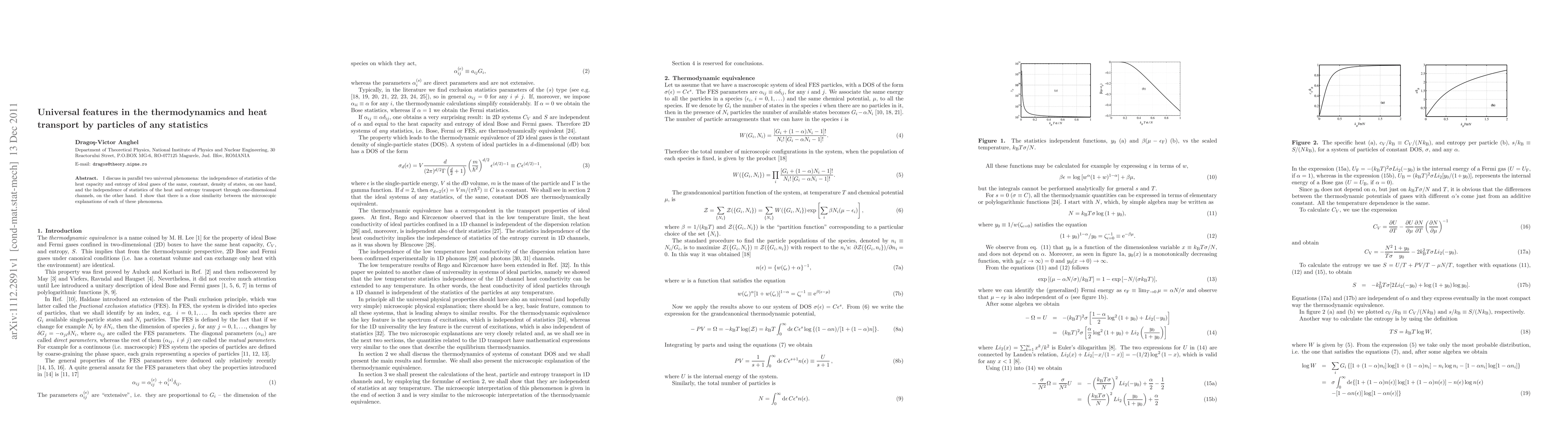 I discuss in parallel two universal phenomena: the independence of statistics of the heat capacity and entropy of ideal gases of the same, constant, density of states, on one hand, and the independence of statistics of the heat and entropy transport through one-dimensional channels, on the other hand. I show that there is a close similarity between the microscopic explanations of each of these phenomena.