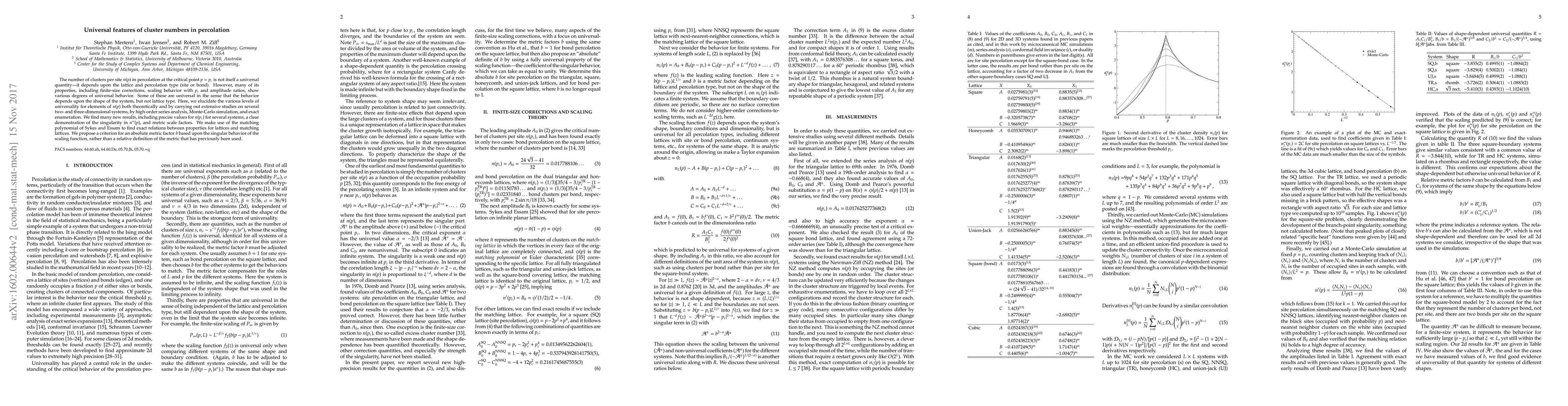This paper investigates the universal features of cluster numbers in percolation, revealing that while $n(p)$ itself is not universal, many of its properties exhibit various levels of universality. The authors use high-order series analysis, Monte-Carlo simulations, and exact enumeration to uncover precise values for $n(p_c)$, singularity in $n''(p)$, and metric scale factors, proposing a new criterion for an absolute metric factor based on scaling function behavior.