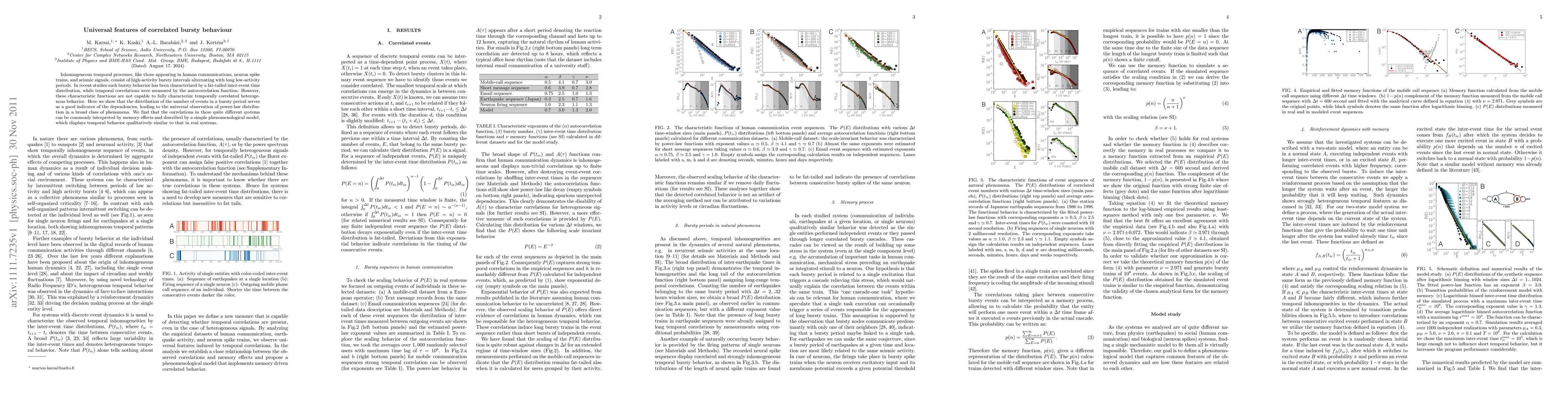 This paper explores the universal features of bursty behavior across diverse systems, demonstrating that the distribution of events within bursty periods reveals underlying temporal correlations. It identifies a power-law distribution as a common indicator and proposes a simple phenomenological model to describe these memory-driven correlations.
