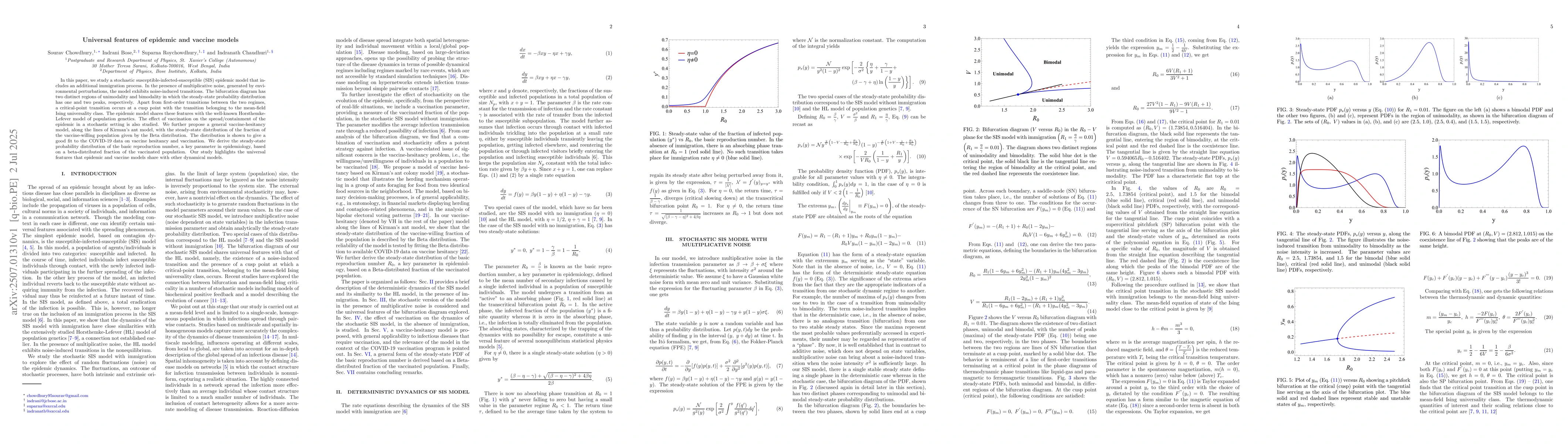 In this paper, we study a stochastic susceptible-infected-susceptible (SIS) epidemic model that includes an additional immigration process. In the presence of multiplicative noise, generated by environmental perturbations, the model exhibits noise-induced transitions. The bifurcation diagram has two distinct regions of unimodality and bimodality in which the steady-state probability distribution has one and two peaks, respectively. Apart from first-order transitions between the two regimes, a critical-point transition occurs at a cusp point with the transition belonging to the mean-field Ising universality class. The epidemic model shares these features with the well-known Horsthemke-Lefever model of population genetics. The effect of vaccination on the spread/containment of the epidemic in a stochastic setting is also studied. We further propose a general vaccine-hesitancy model, along the lines of Kirman's ant model, with the steady-state distribution of the fraction of the vaccine-willing population given by the Beta distribution. The distribution is shown to give a good fit to the COVID-19 data on vaccine hesitancy and vaccination. We derive the steady-state probability distribution of the basic reproduction number, a key parameter in epidemiology, based on a beta-distributed fraction of the vaccinated population. Our study highlights the universal features that epidemic and vaccine models share with other dynamical models.
