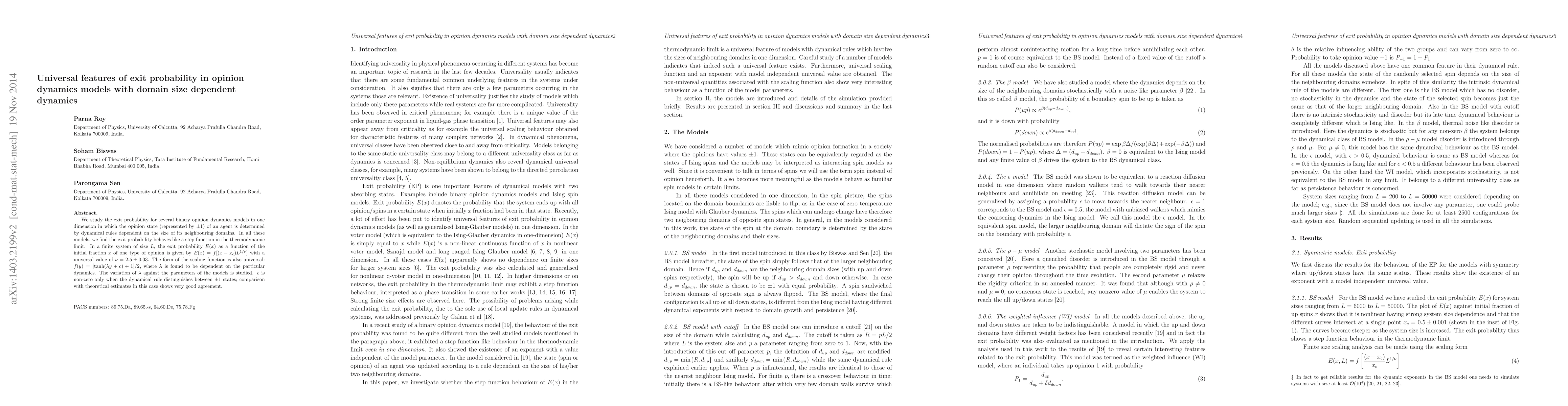 We study the exit probability for several binary opinion dynamics models in one dimension in which the opinion state (represented by $\pm 1$) of an agent is determined by dynamical rules dependent on the size of its neighbouring domains. In all these models, we find the exit probability behaves like a step function in the thermodynamic limit. In a finite system of size $L$, the exit probability $E(x)$ as a function of the initial fraction $x$ of one type of opinion is given by $E(x) = f[(x-x_c)L^{1/\nu}]$ with a universal value of $\nu = 2.5 \pm 0.03$. The form of the scaling function is also universal: $f(y) = [\tanh(\lambda y +c) +1]/2$, where $\lambda$ is found to be dependent on the particular dynamics. The variation of $\lambda$ against the parameters of the models is studied. $c$ is non-zero only when the dynamical rule distinguishes between $\pm 1$ states; comparison with theoretical estimates in this case shows very good agreement.