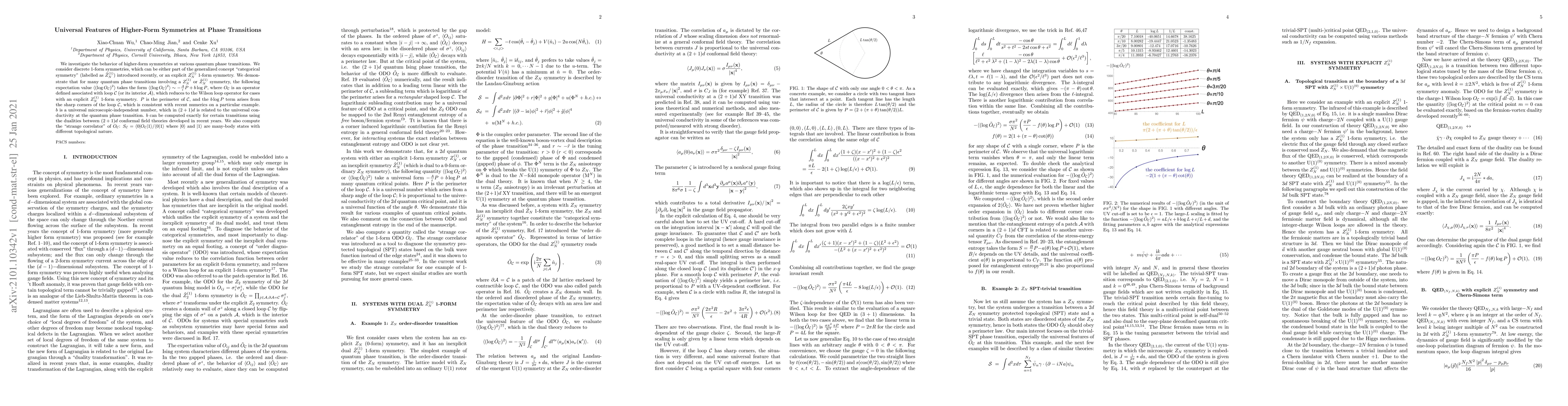 We investigate the behavior of higher-form symmetries at various quantum phase transitions. We consider discrete 1-form symmetries, which can be either part of the generalized concept "categorical symmetry" (labelled as $\tilde{Z}_N^{(1)}$) introduced recently, or an explicit $Z_N^{(1)}$ 1-form symmetry. We demonstrate that for many quantum phase transitions involving a $Z_N^{(1)}$ or $\tilde{Z}_N^{(1)}$ symmetry, the following expectation value $ \langle \left( \log O_\mathcal{C} \right)^2 \rangle$ takes the form $\langle \left( \log O_\mathcal{C} \right)^2 \rangle \sim - \frac{A}{\epsilon} P+ b \log P $, where $O_\mathcal{C}$ is an operator defined associated with loop $\mathcal{C}$ (or its interior $\mathcal{A}$), which reduces to the Wilson loop operator for cases with an explicit $Z_N^{(1)}$ 1-form symmetry. $P$ is the perimeter of $\mathcal{C}$, and the $b \log P$ term arises from the sharp corners of the loop $\mathcal{C}$, which is consistent with recent numerics on a particular example. $b$ is a universal microscopic-independent number, which in (2+1)d is related to the universal conductivity at the quantum phase transition. $b$ can be computed exactly for certain transitions using the dualities between (2+1)d conformal field theories developed in recent years. We also compute the "strange correlator" of $O_\mathcal{C}$: $S_{\mathcal{C}} = \langle 0 | O_\mathcal{C} | 1 \rangle / \langle 0 | 1 \rangle$ where $|0\rangle$ and $|1\rangle$ are many-body states with different topological nature.