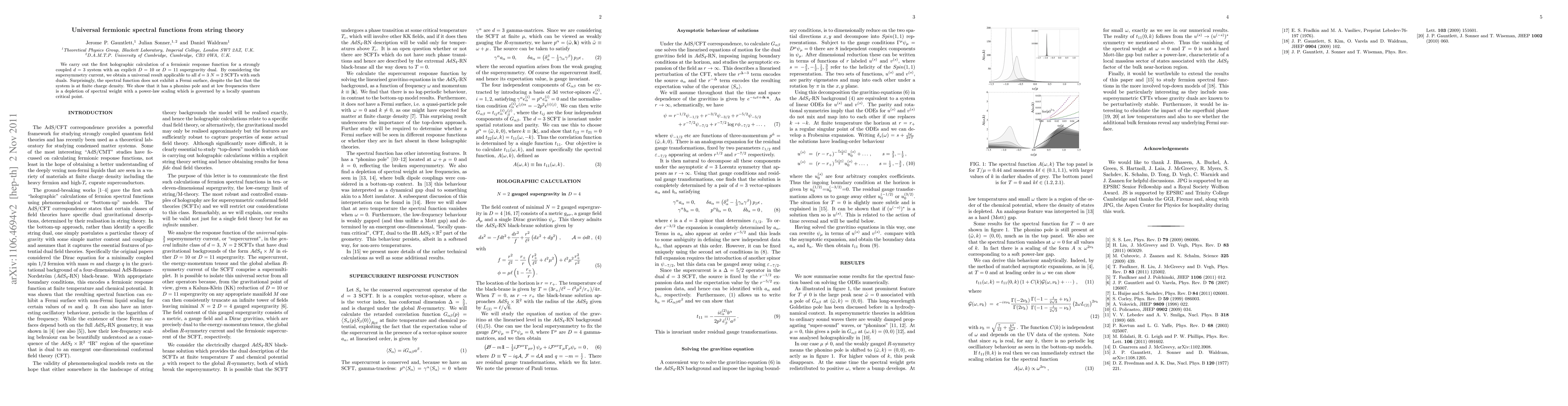 We carry out the first holographic calculation of a fermionic response function for a strongly coupled $d=3$ system with an explicit D=10 or D=11 supergravity dual. By considering the supersymmetry current, we obtain a universal result applicable to all d=3 N=2 SCFTs with such duals. Surprisingly, the spectral function does not exhibit a Fermi surface, despite the fact that the system is at finite charge density. We show that it has a phonino pole and at low frequencies there is a depletion of spectral weight with a power-law scaling which is governed by a locally quantum critical point.