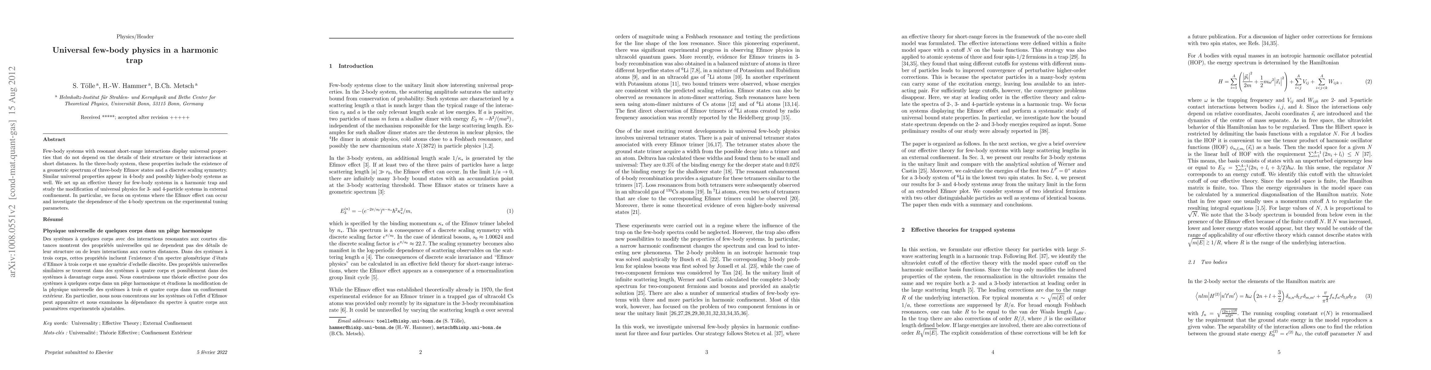 This paper develops an effective theory for few-body systems in a harmonic trap, exploring universal properties like the Efimov effect in 3-body and 4-body systems. It investigates how external confinement modifies these universal physics, particularly focusing on the 4-body spectrum's dependence on experimental tuning parameters.