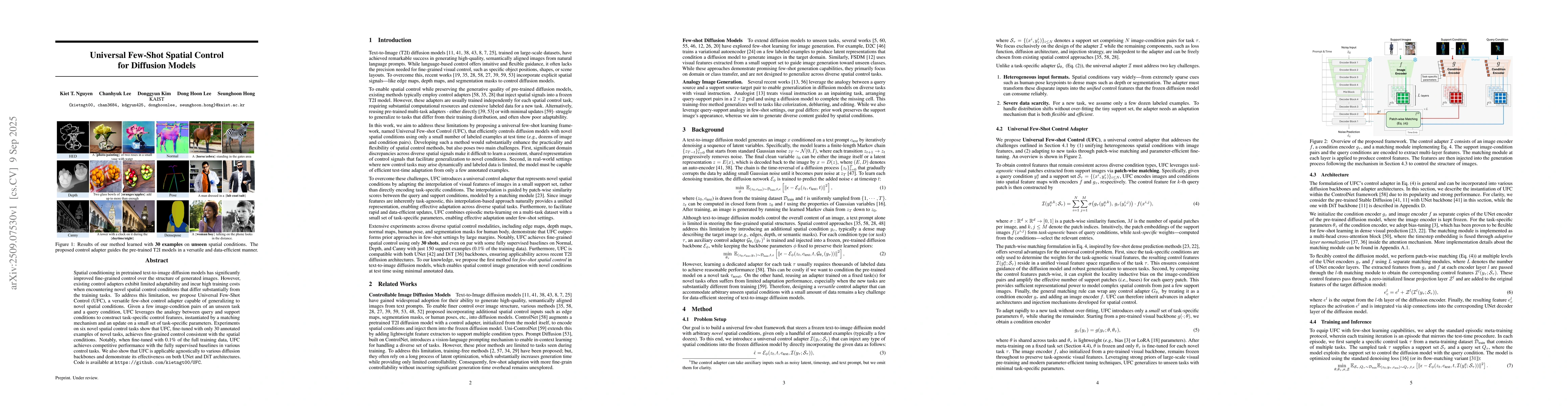Spatial conditioning in pretrained text-to-image diffusion models has significantly improved fine-grained control over the structure of generated images. However, existing control adapters exhibit limited adaptability and incur high training costs when encountering novel spatial control conditions that differ substantially from the training tasks. To address this limitation, we propose Universal Few-Shot Control (UFC), a versatile few-shot control adapter capable of generalizing to novel spatial conditions. Given a few image-condition pairs of an unseen task and a query condition, UFC leverages the analogy between query and support conditions to construct task-specific control features, instantiated by a matching mechanism and an update on a small set of task-specific parameters. Experiments on six novel spatial control tasks show that UFC, fine-tuned with only 30 annotated examples of novel tasks, achieves fine-grained control consistent with the spatial conditions. Notably, when fine-tuned with 0.1% of the full training data, UFC achieves competitive performance with the fully supervised baselines in various control tasks. We also show that UFC is applicable agnostically to various diffusion backbones and demonstrate its effectiveness on both UNet and DiT architectures. Code is available at https://github.com/kietngt00/UFC.