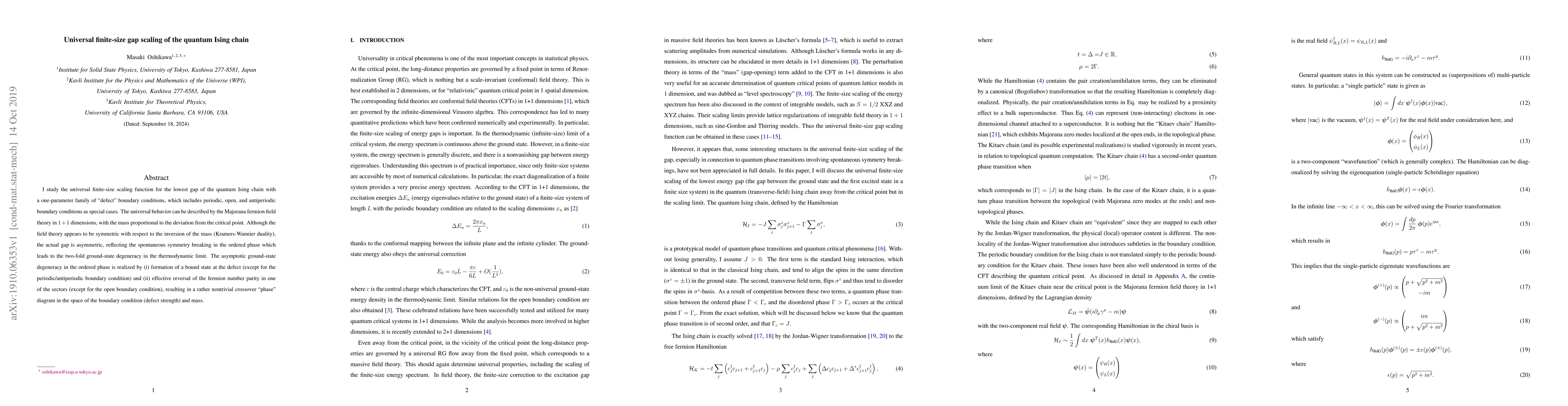 This paper investigates the finite-size scaling behavior of the lowest energy gap in the quantum Ising chain under various boundary conditions, revealing a universal scaling function described by Majorana fermion field theory. The study highlights the asymmetric gap due to spontaneous symmetry breaking, leading to a complex phase diagram influenced by defect strength and boundary conditions.