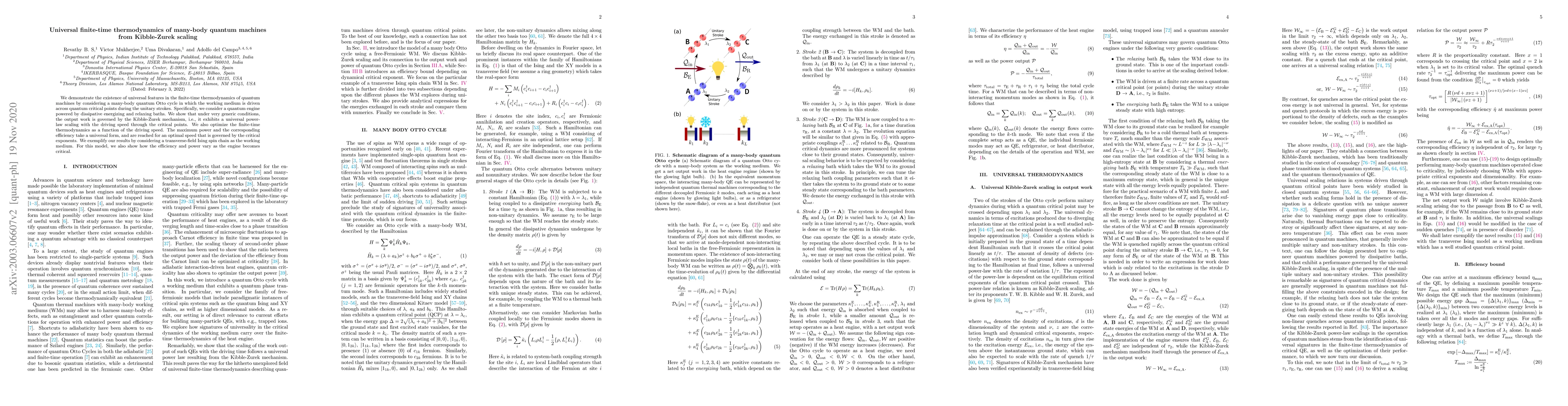 We demonstrate the existence of universal features in the finite-time thermodynamics of quantum machines by considering a many-body quantum Otto cycle in which the working medium is driven across quantum critical points during the unitary strokes. Specifically, we consider a quantum engine powered by dissipative energizing and relaxing baths. We show that under very generic conditions, the output work is governed by the Kibble-Zurek mechanism, i.e., it exhibits a universal power-law scaling with the driving speed through the critical points. We also optimize the finite-time thermodynamics as a function of the driving speed. The maximum power and the corresponding efficiency take a universal form, and are reached for an optimal speed that is governed by the critical exponents. We exemplify our results by considering a transverse-field Ising spin chain as the working medium. For this model, we also show how the efficiency and power vary as the engine becomes critical.