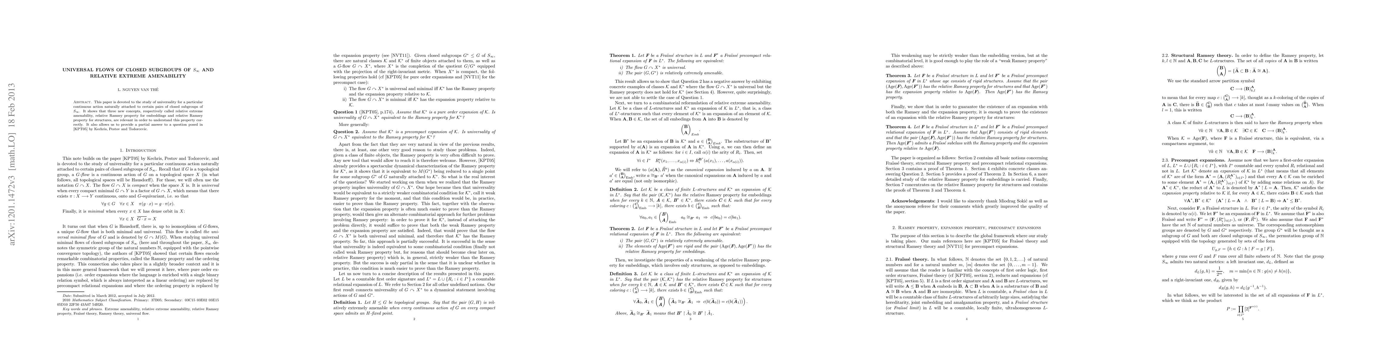 This paper is devoted to the study of universality for a particular continuous action naturally attached to certain pairs of closed subgroups of $S_{\infty}$. It shows that three new concepts, respectively called relative extreme amenability, relative Ramsey property for embeddings, and relative Ramsey property for structures, are relevant in order to understand this property correctly. It also allows to provide a partial answer to a question posed by Kechris, Pestov and Todorcevic.