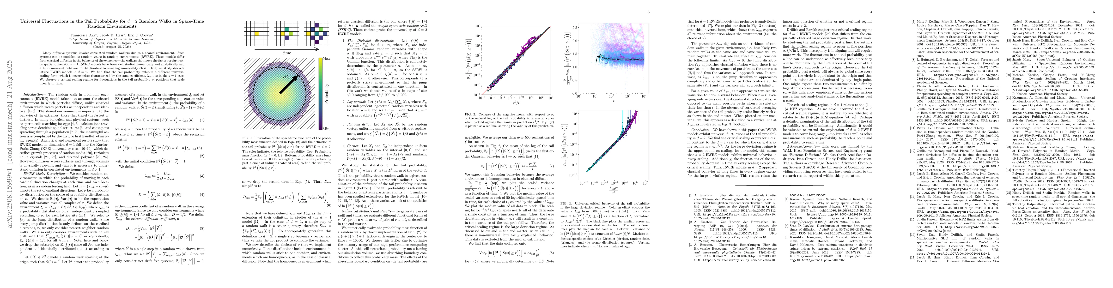 Many diffusive systems involve correlated random walkers due to a shared environment. Such systems can be modeled as random walks in random environments (RWRE). These models differ from classical diffusion in the behavior of the extremes -- the walkers that move the fastest or farthest. In spatial dimension $d=1$ RWRE models have been well studied numerically and analytically and exhibit universal behavior in the Kardar-Parisi-Zhang universality class. Here, we study discrete lattice RWRE models in $d=2$. We find that the tail probability exhibits a different universal scaling form, which is nevertheless characterized by the same coefficient, $\lambda_\mathrm{ext}$, as in the $d=1$ case. We observe a critical scaling regime for fluctuations in the tail probability at positions that scale linearly in time.