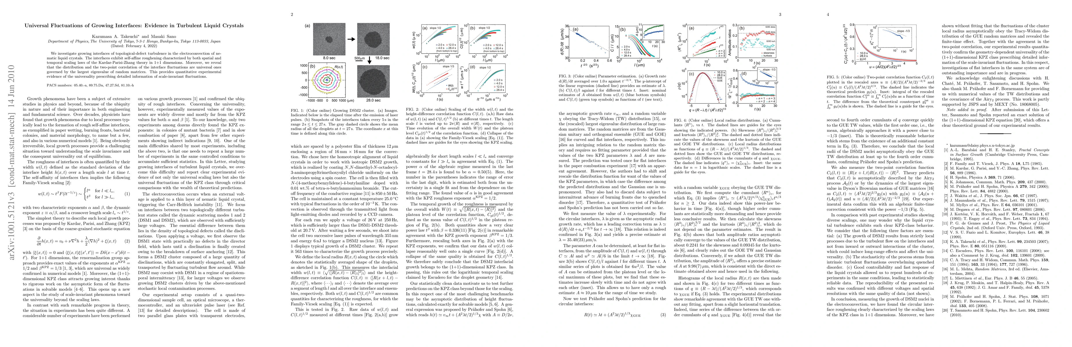This paper investigates the growing interfaces in turbulent electroconvection of nematic liquid crystals, showing they follow self-affine roughening and Kardar-Parisi-Zhang scaling laws. It reveals universal fluctuations governed by the largest eigenvalue of random matrices, providing experimental evidence for the universality of scale-invariant fluctuations.
