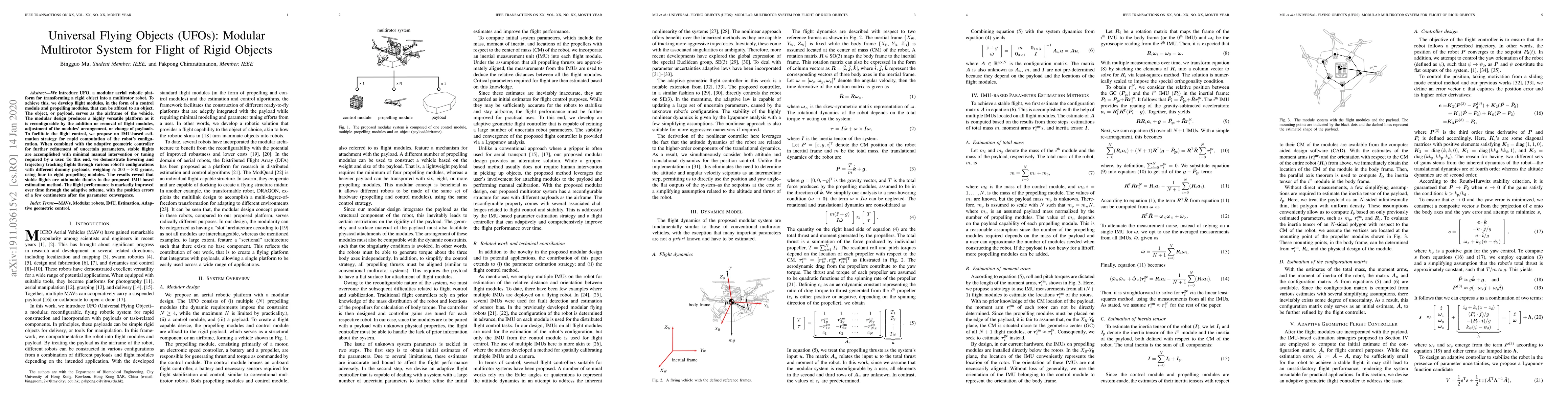 We introduce UFO, a modular aerial robotic platform for transforming a rigid object into a multirotor robot. To achieve this, we develop flight modules, in the form of a control module and propelling modules, that can be affixed to an object. The object, or payload, serves as the airframe of the vehicle. The modular design produces a highly versatile platform as it is reconfigurable by the addition or removal of flight modules, adjustment of the modules' arrangement, or change of payloads. To facilitate the flight control, we propose an IMU-based estimation strategy for rapid computation of the robot's configuration. When combined with the adaptive geometric controller for further refinement of uncertain parameters, stable flights are accomplished with minimal manual intervention or tuning required by a user. To this end, we demonstrate hovering and trajectory tracking flights through various robot's configurations with different dummy payloads, weighing ~200-800 grams, using four to eight propelling modules. The results reveal that stable flights are attainable thanks to the proposed IMU-based estimation method. The flight performance is markedly improved over time through the adaptive scheme, with the position errors of a few centimeters after the parameter convergence.