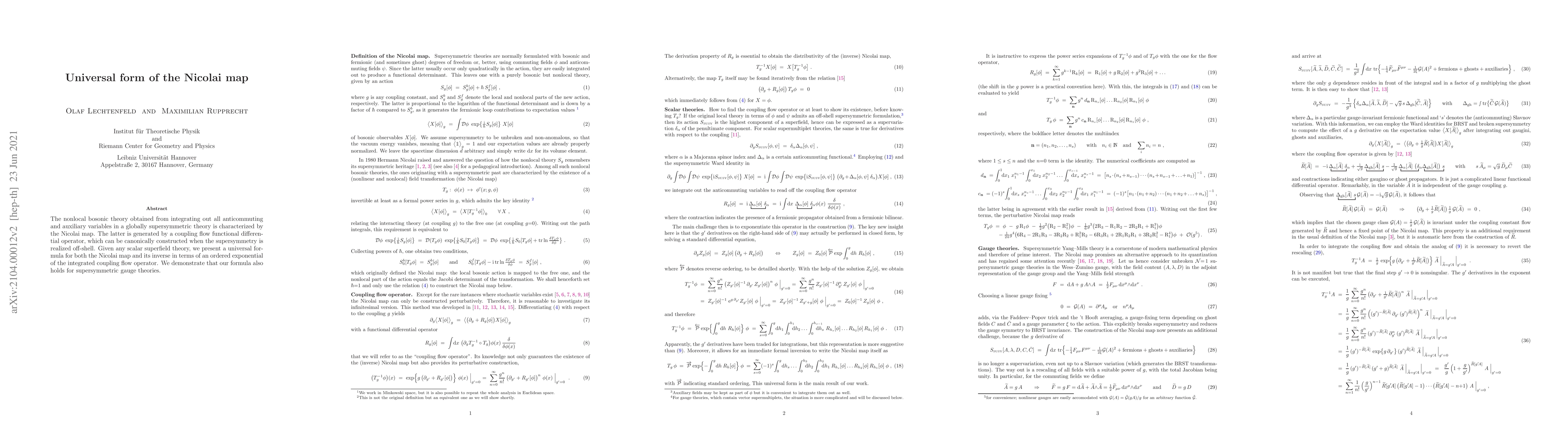 This paper presents a universal formula for the Nicolai map and its inverse in globally supersymmetric theories, expressed as an ordered exponential of an integrated coupling flow operator. The formula is shown to apply to both scalar superfield and supersymmetric gauge theories.