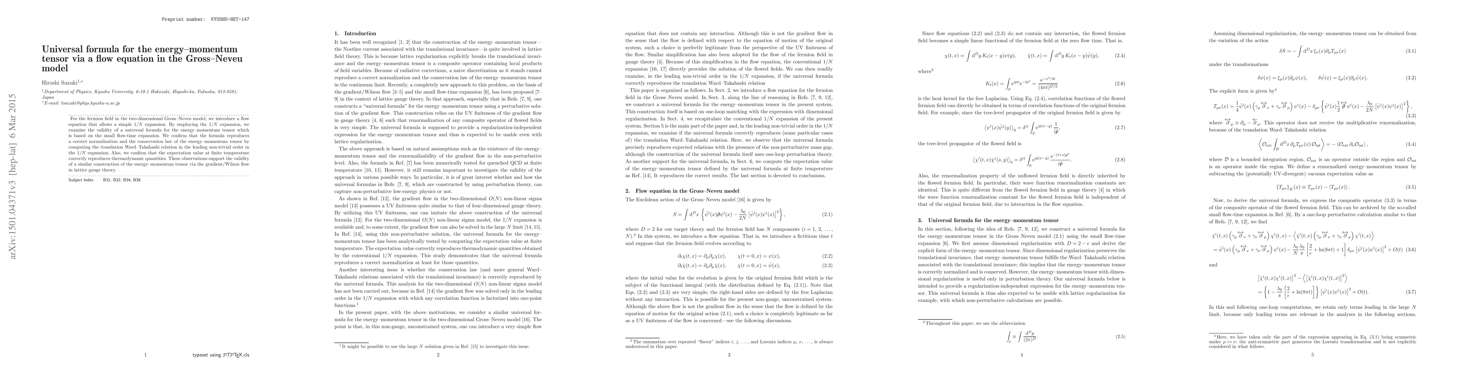 This paper introduces a flow equation for the two-dimensional Gross--Neveu model, allowing for a $1/N$ expansion, and validates a universal formula for the energy--momentum tensor based on small flow-time expansion, confirming its correctness through the translation Ward--Takahashi relation and thermodynamic consistency.