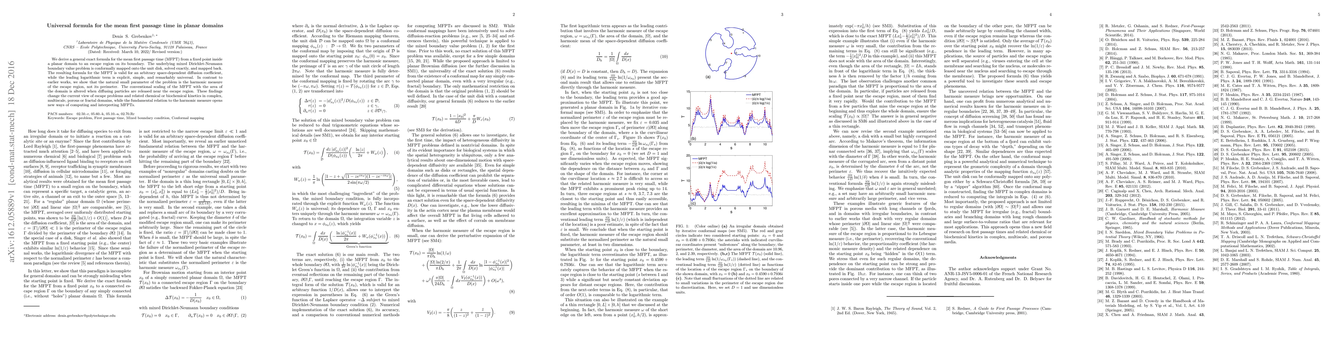 Researchers derive a universal formula for the mean first passage time in planar domains, revealing a fundamental relation to the harmonic measure that alters conventional scaling assumptions.