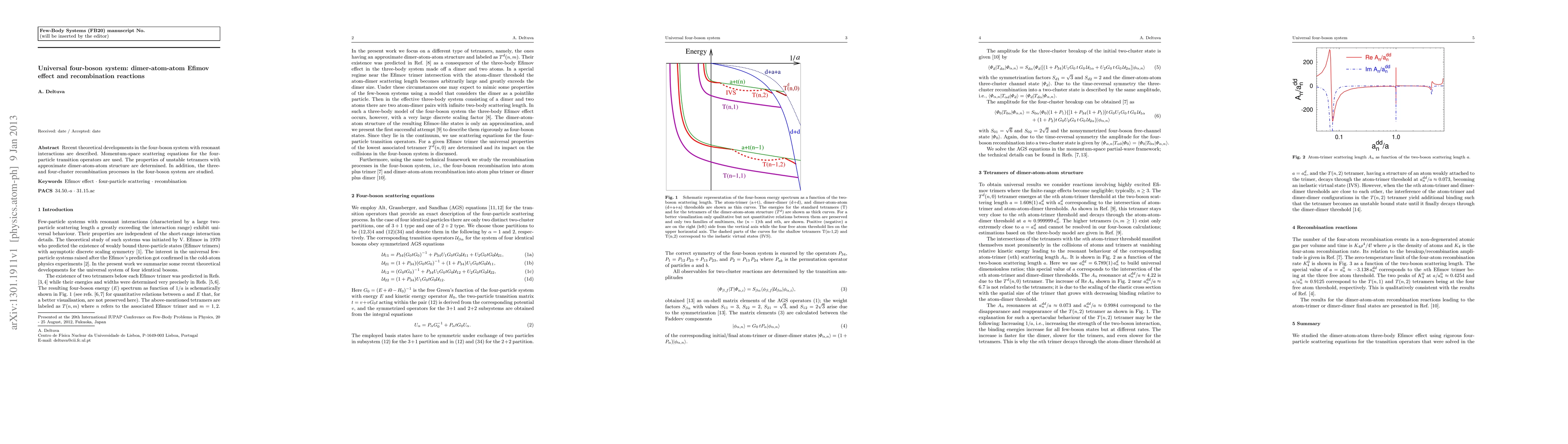 Recent theoretical developments in the four-boson system with resonant interactions are described. Momentum-space scattering equations for the four-particle transition operators are used. The properties of unstable tetramers with approximate dimer-atom-atom structure are determined. In addition, the three- and four-cluster recombination processes in the four-boson system are studied.
