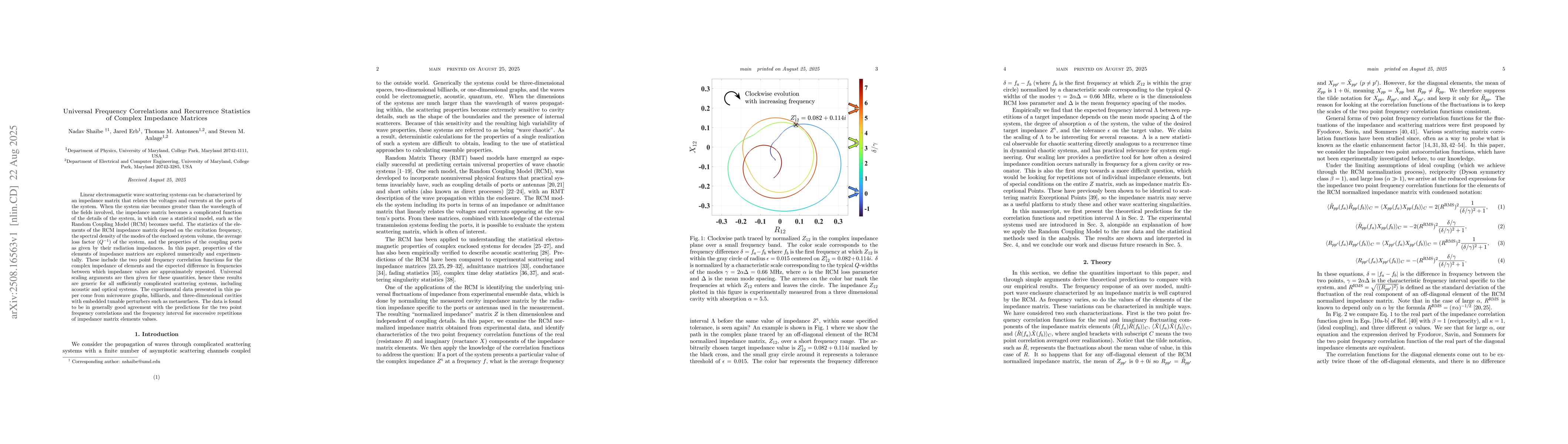 Linear electromagnetic wave scattering systems can be characterized by an impedance matrix that relates the voltages and currents at the ports of the system. When the system size becomes greater than the wavelength of the fields involved, the impedance matrix becomes a complicated function of the details of the system, in which case a statistical model, such as the Random Coupling Model (RCM) becomes useful. The statistics of the elements of the RCM impedance matrix depend on the excitation frequency, the spectral density of the modes of the enclosed system volume, the average loss factor (Q^{-1}) of the system, and the properties of the coupling ports as given by their radiation impedances. In this paper, properties of the elements of impedance matrices are explored numerically and experimentally. These include the two point frequency correlation functions for the complex impedance of elements and the expected difference in frequencies between which impedance values are approximately repeated. Universal scaling arguments are then given for these quantities, hence these results are generic for all sufficiently complicated scattering systems, including acoustic and optical systems. The experimental data presented in this paper come from microwave graphs, billiards, and three-dimensional cavities with embedded tunable perturbers such as metasurfaces. The data is found to be in generally good agreement with the predictions for the two point frequency correlations and the frequency interval for successive repetitions of impedance matrix elements values.
