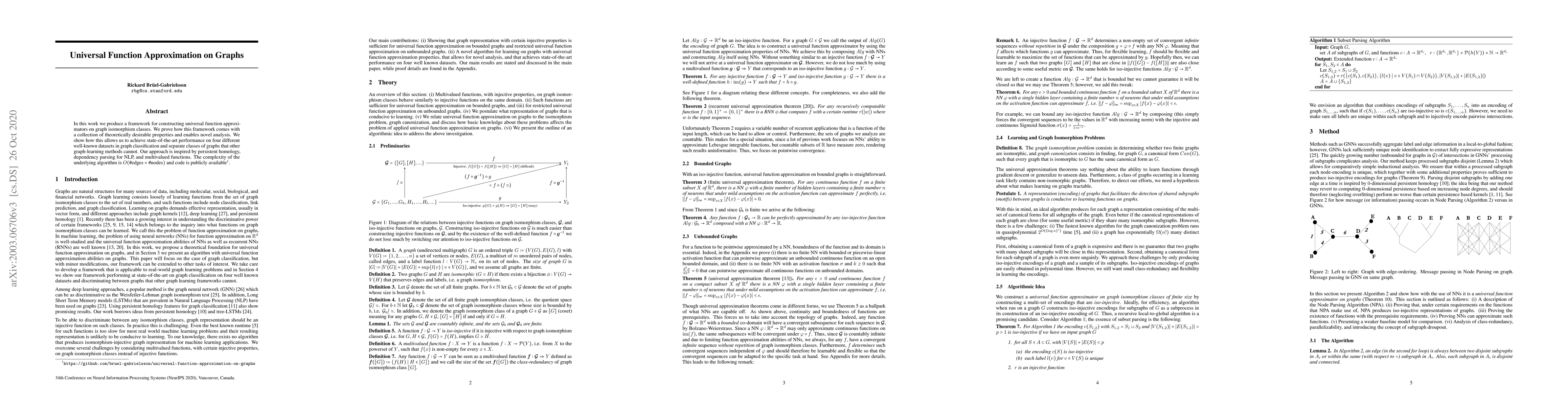 In this work we produce a framework for constructing universal function approximators on graph isomorphism classes. We prove how this framework comes with a collection of theoretically desirable properties and enables novel analysis. We show how this allows us to achieve state-of-the-art performance on four different well-known datasets in graph classification and separate classes of graphs that other graph-learning methods cannot. Our approach is inspired by persistent homology, dependency parsing for NLP, and multivalued functions. The complexity of the underlying algorithm is O(#edges x #nodes) and code is publicly available (https://github.com/bruel-gabrielsson/universal-function-approximation-on-graphs).