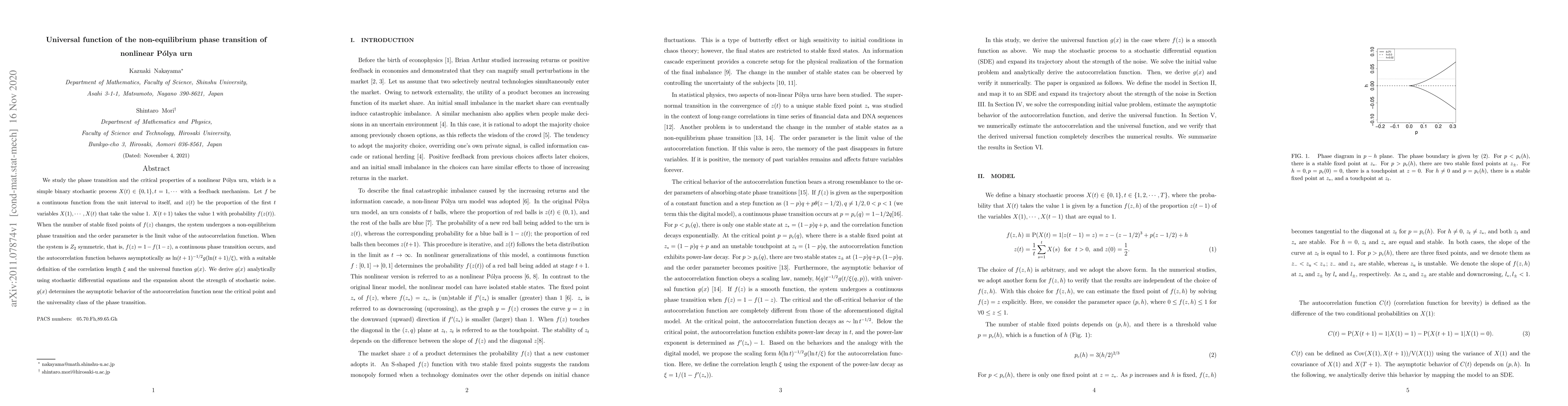 We study the phase transition and the critical properties of a nonlinear P\'{o}lya urn, which is a simple binary stochastic process $X(t)\in \{0,1\},t=1,\cdots$ with a feedback mechanism. Let $f$ be a continuous function from the unit interval to itself, and $z(t)$ be the proportion of the first $t$ variables $X(1),\cdots,X(t)$ that take the value 1. $X(t+1)$ takes the value 1 with probability $f(z(t))$. When the number of stable fixed points of $f(z)$ changes, the system undergoes a non-equilibrium phase transition and the order parameter is the limit value of the autocorrelation function. When the system is $Z_{2}$ symmetric, that is, $f(z)=1-f(1-z)$, a continuous phase transition occurs, and the autocorrelation function behaves asymptotically as $\ln(t+1)^{-1/2}g(\ln(t+1)/\xi)$, with a suitable definition of the correlation length $\xi$ and the universal function $g(x)$. We derive $g(x)$ analytically using stochastic differential equations and the expansion about the strength of stochastic noise. $g(x)$ determines the asymptotic behavior of the autocorrelation function near the critical point and the universality class of the phase transition.